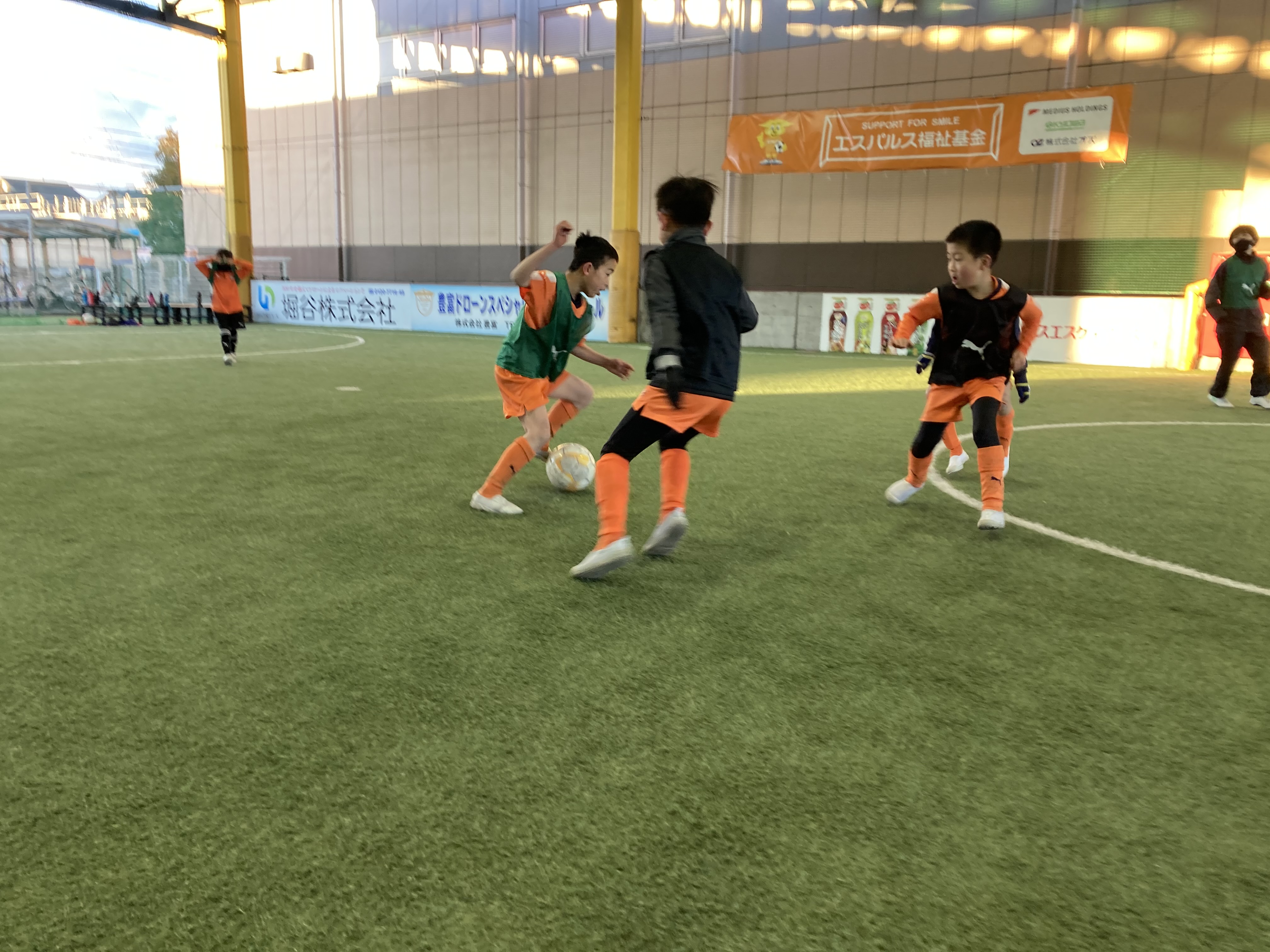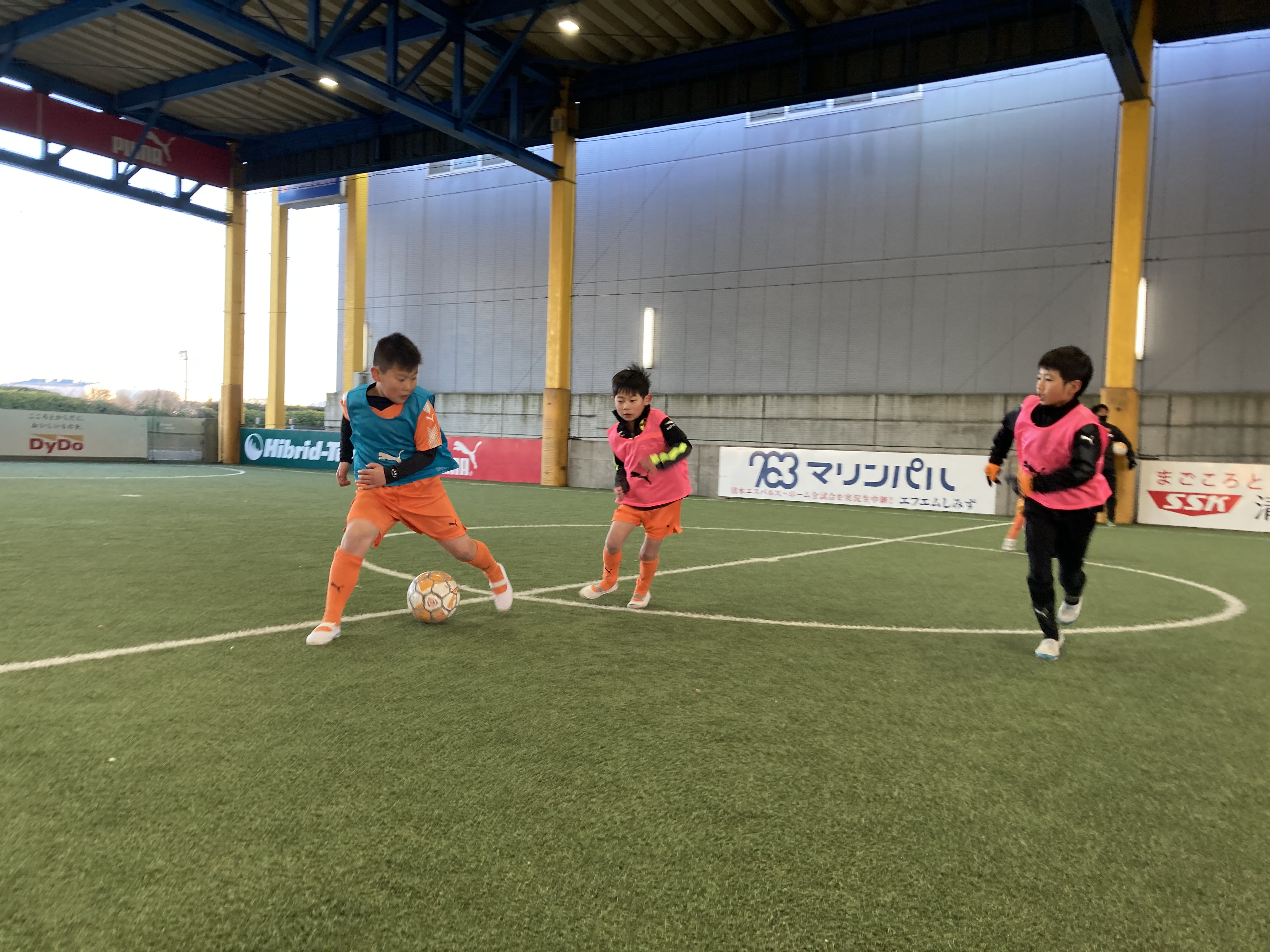 今年度スクールが始動した当初は、相手二人に囲まれスペースがない状況にも関わらずドリブルをしてしまい、簡単にボールを失ってしまう場面も多々ありました。