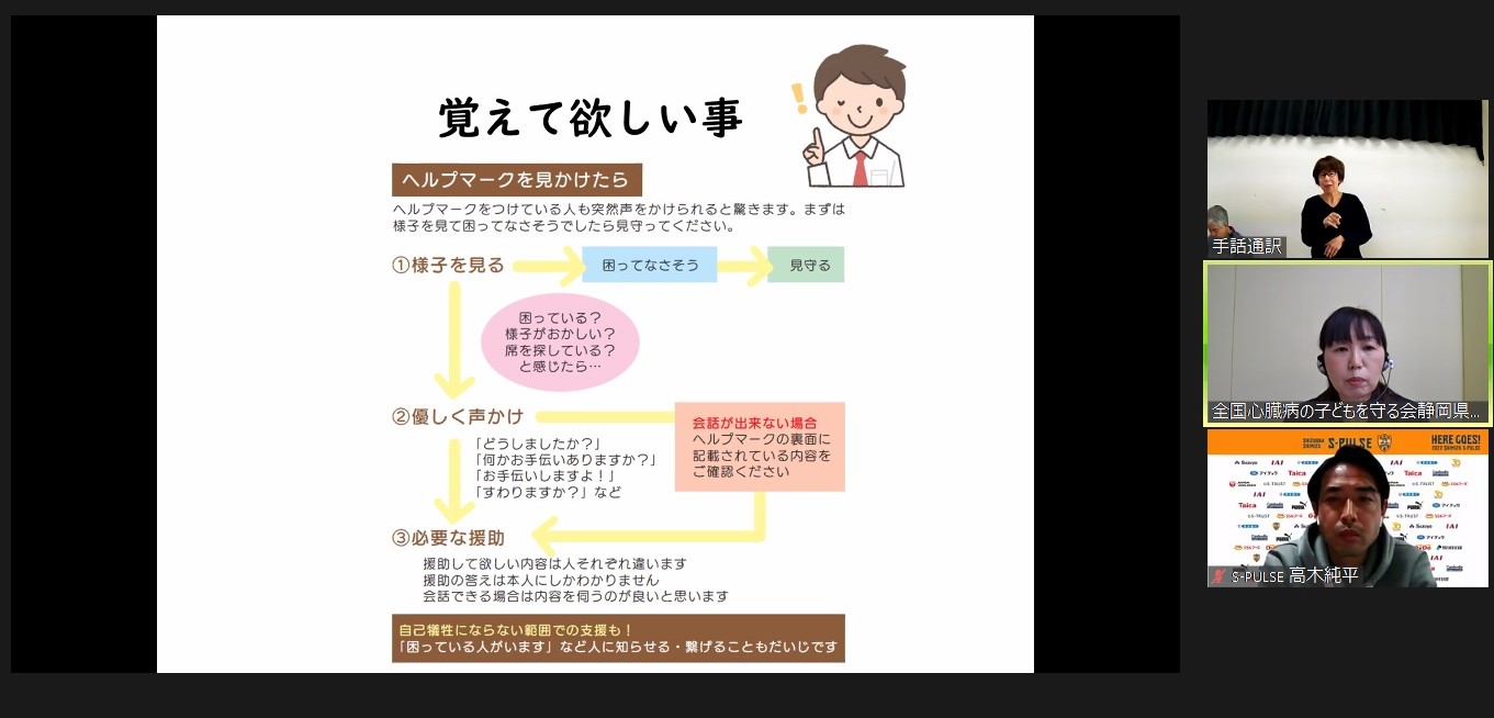 2月22日(火)にオンラインにて開催された『ヘルプマーク周知フォーラム』(主催:静岡県 健康福祉部障害者政策課、運営:NPO法人オールしずおかベストコミュニティ)に株式会社エスパルス 広報部の高木純平がゲストスピーカーとして参加しました。