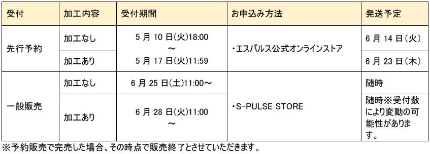 ・加工なしを購入されたお客様で、商品到着後に加工を希望される場合は、6/25(土)以降にS-PULSE STORE(店舗)で加工をお受け付けいたします。加工内容は上記記載の内容と同様になります。店舗在庫の状況によってはご希望の加工をお受け付けできかねますので予めご了承ください。