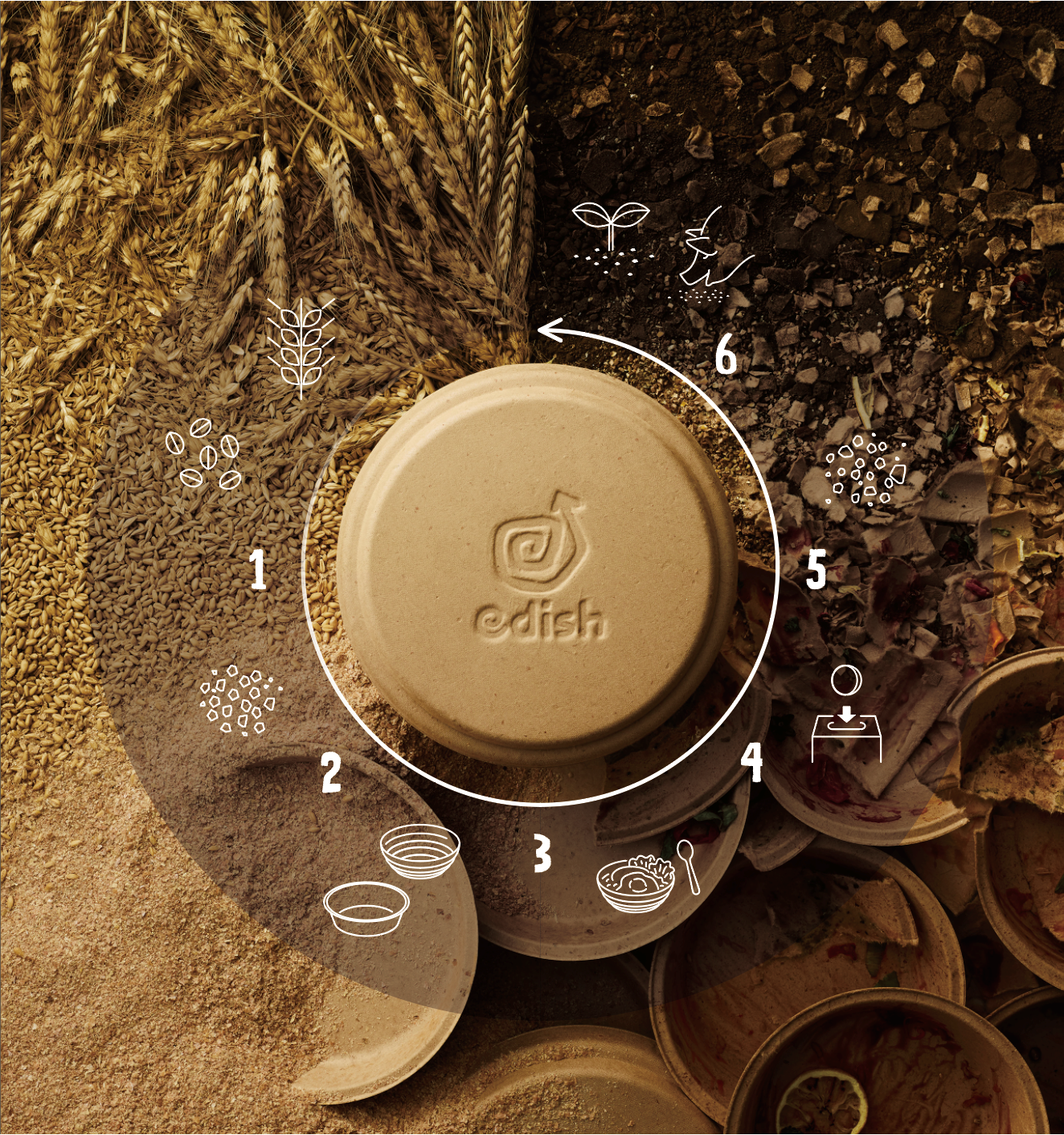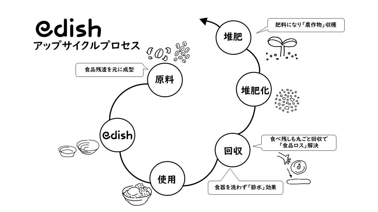edishとは、丸紅株式会社が実証実験を行う何度でも生まれ変わることができる〝循環型食器″。これまでほとんど用途がなかった食物の皮や芯などの食品廃材を独自の技術で食器に成型し飲食店へ提供。使用後は食器を回収し、工場にて粉砕・乾燥、その後、飼料や肥料、残コンクリート処理剤などへ加工し、事業者に提供することを目指しています。