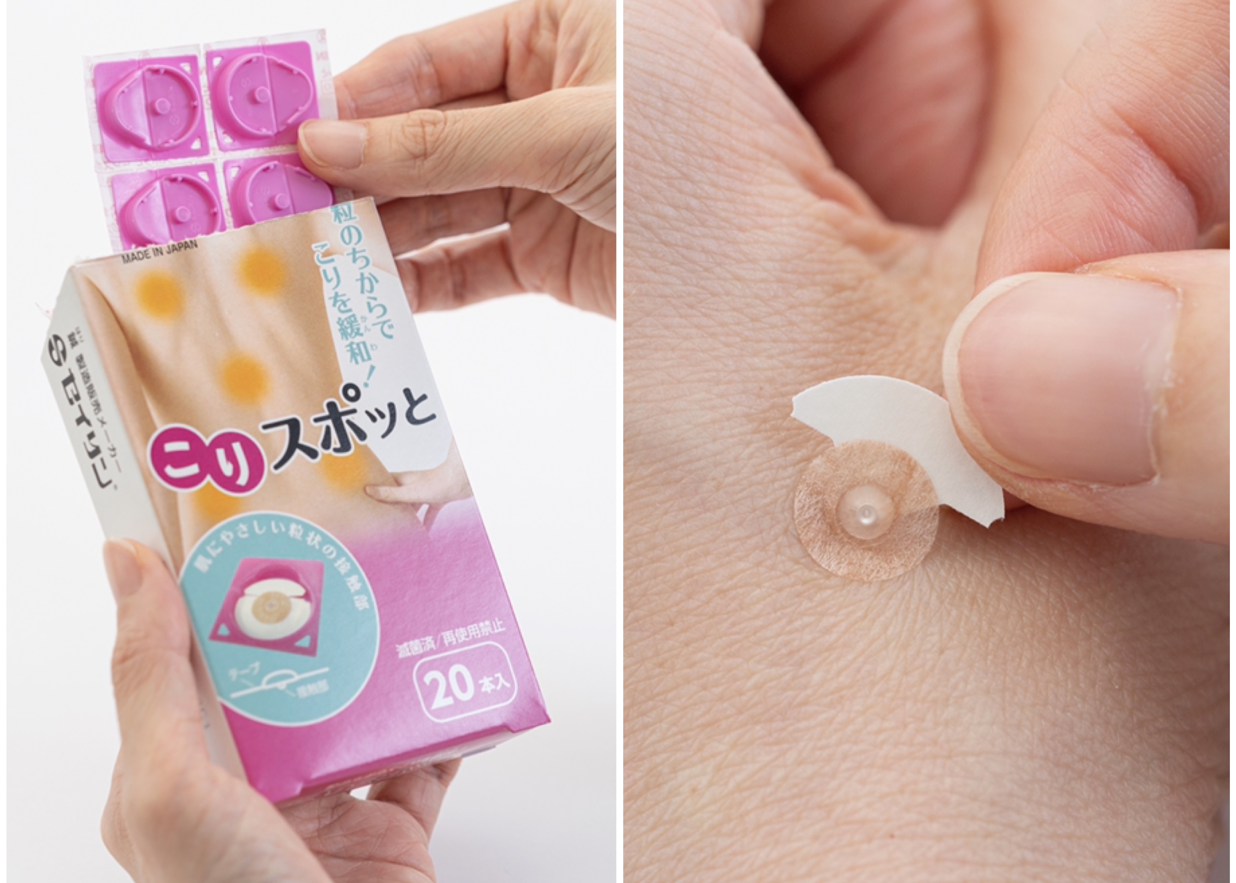 家庭用のセルフケア商品「こりスポッと」を使って、コリが気になる部位のツボに貼る「ツボ刺激体験」。丸いシールに小さな樹脂の粒が付いており、鍼のように刺さったりしないタイプなので、金属アレルギーの方や、鍼が苦手な方にも抵抗なく体験いただくことができました。参加者の皆さんは、それぞれコリが気になる部位に、運動の前や後に「ツボ刺激」体験をしていただき、セイリンの鍼灸商品の効果を実感いただきました。