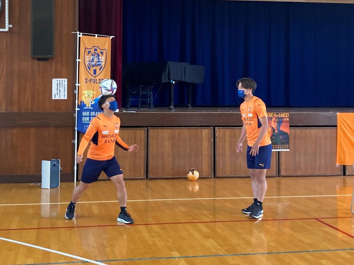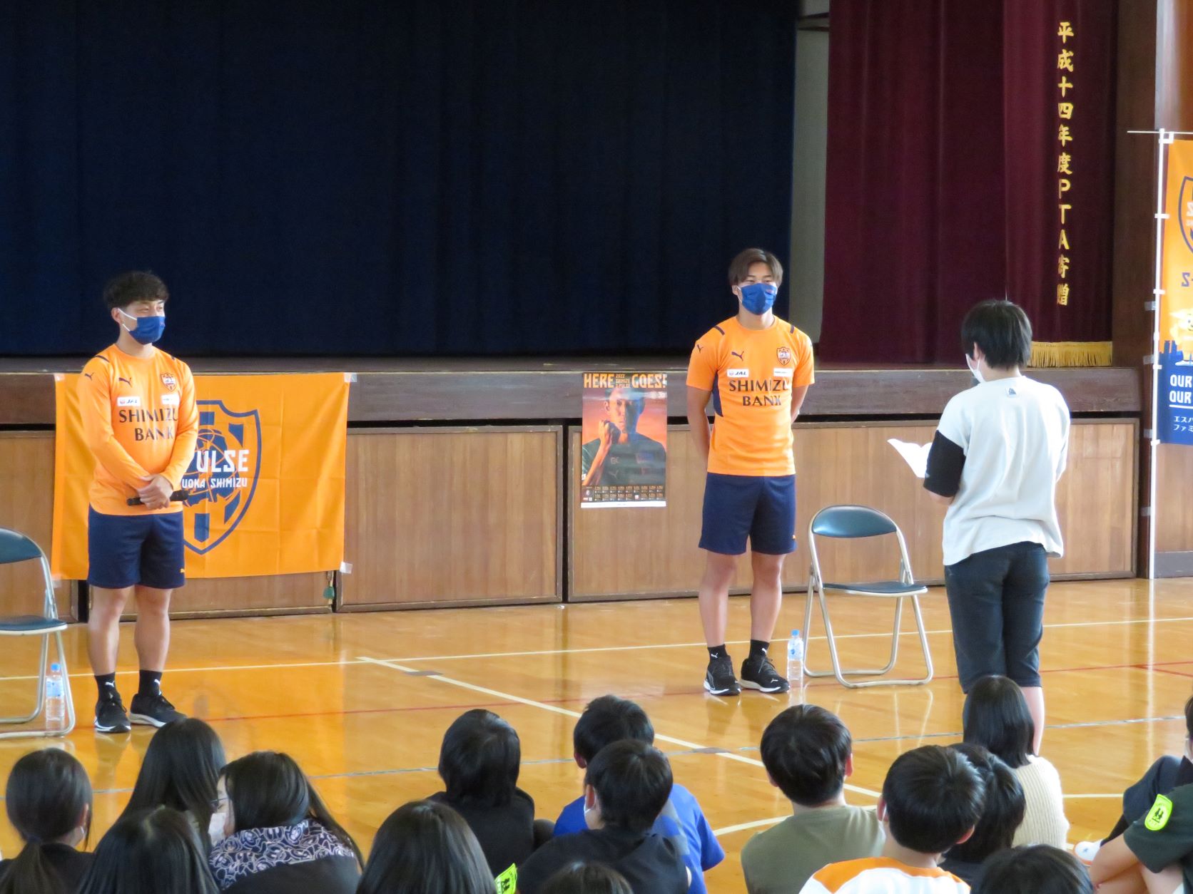 これからの目標を聞かれると、山原選手は「日本代表になること。そして長くプロ生活を続けること。」、千葉選手は「まずは試合に出てチームを勝利させること。子どもたちに夢を与えられる選手になりたい。」と力強く語ってくれました。また今回のような地域貢献活動について、「プロサッカー選手になり、応援してくれる皆さんに日々支えられていると感じている。このように学校訪問をしたり直接会って想いを伝えたり少しでもその恩返しができれば。」と山原選手が話すと、千葉選手も「小学6年生の時にエスパルスの選手が今回のように学校に来てくれて、自分もプロになりたいと思った。今日の訪問が皆さんにとって何かの‘きっかけ’になれば嬉しい。」と想いを伝えました。