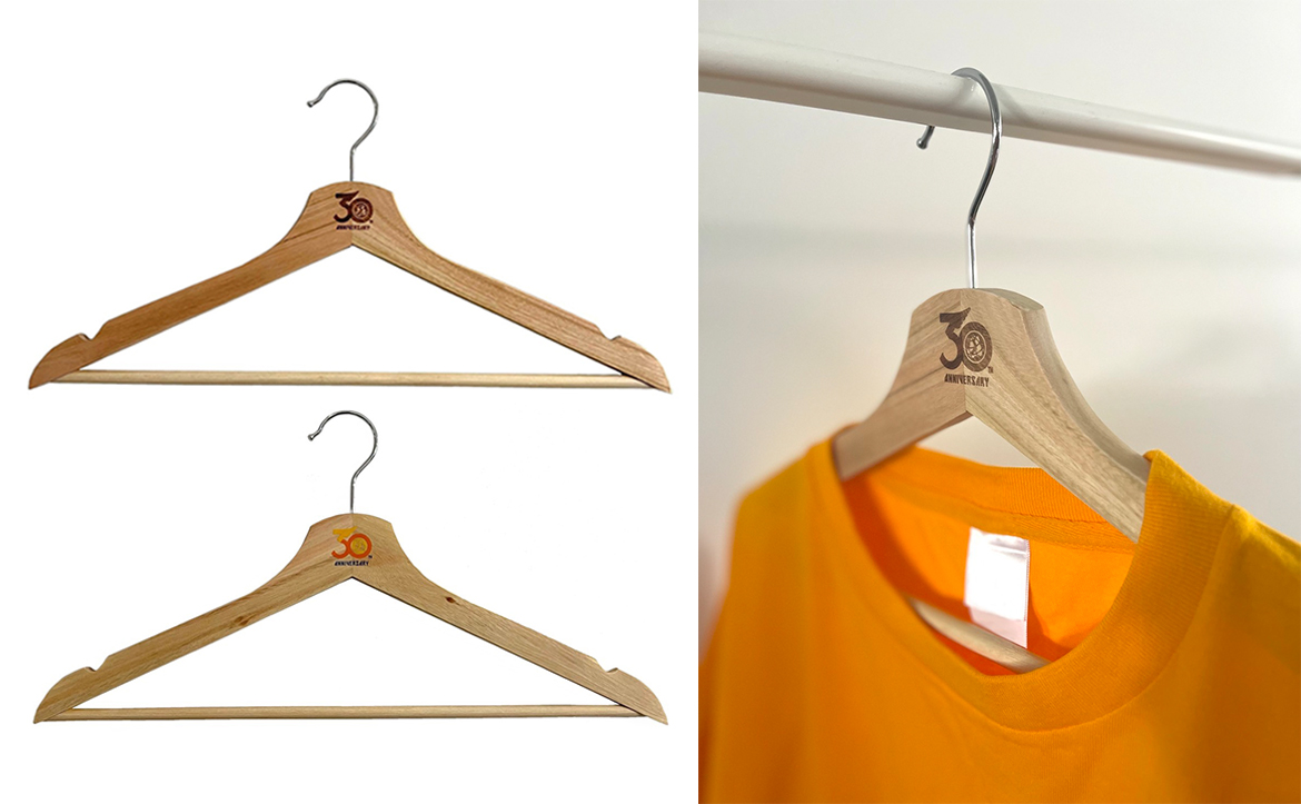 素材は環境にもやさしい木材などの再生可能素材を使用。また重い衣類にも耐えられる強度で、肩ひも付きの服の滑り落ちを防ぐ溝もあり機能性も十分。30周年記念ロゴをエスパルスオレンジと、レーザーで刻印した2種類展開です。