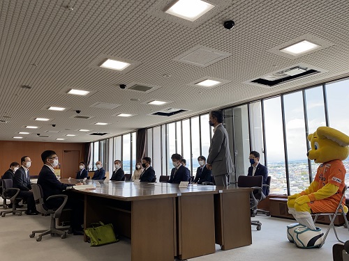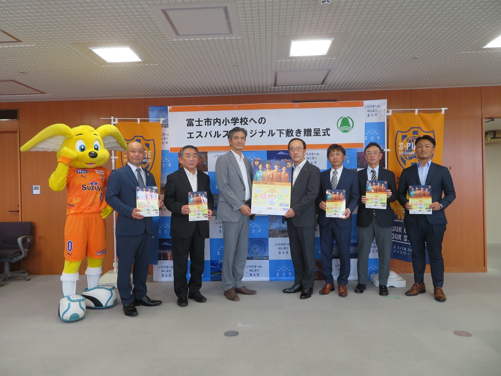 6月9日(木)富士市役所にて下敷きの贈呈式を実施し、株式会社エスパルス 代表取締役社長 山室晋也とオフィシャルマスコットのパルちゃんが参加しました。贈呈式にはご協賛いただいた企業の代表者様にもご出席いただき、富士市 小長井義正市長へ下敷きの贈呈を行いました。