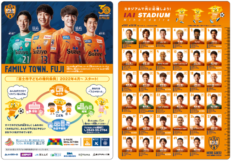 本事業は子どもたちにSDGsや「子どもの権利」について考えるきっかけをつくるとともに、クラブが取り組むスポーツ振興の一環として、地域愛の醸成、プロスポーツへの関心、心身の健全育成を目指すことを目的とし、下敷きの片面に今年4月から施行した「富士市子どもの権利条例」を、もう片面にはエスパルスの選手一覧を掲載しています。