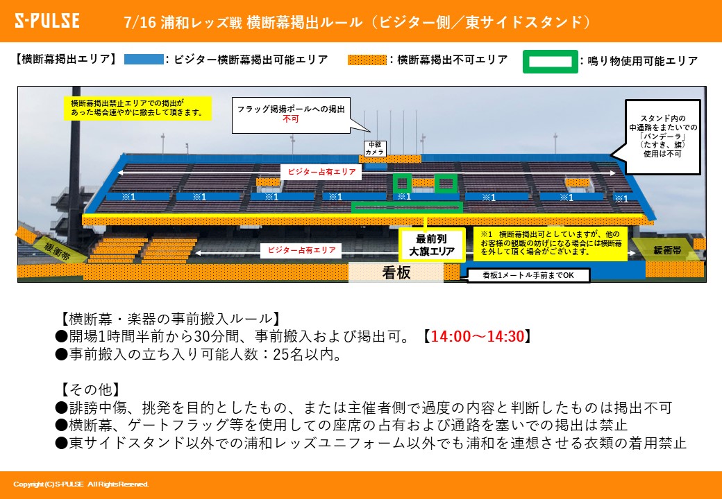 ※1『西サイドゲート』からの入場、ならびに『西サイドスタンド』での観戦は完全に不可。ビジターチームの応援グッズ並びにビジターチームを連想させる衣類(埼玉や浦和の記載)を身に着けた方は『東サイドスタンド』以外の全ての席種で観戦することを禁止とします。