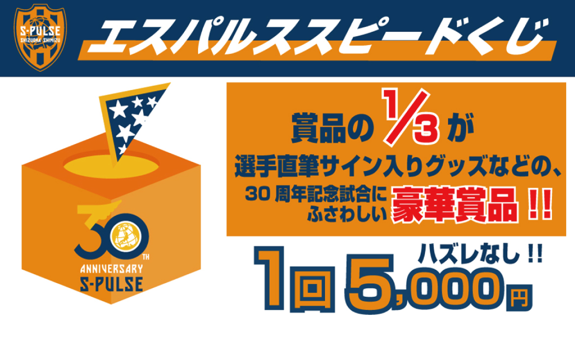 7月2日(土)の清水エスパルスのクラブ創設30周年記念マッチ(2022明治安田生命 J1リーグ 第19節横浜F・マリノス戦)が行われる国立競技場にて、選手の直筆サイングッズ含む30周年記念に相応しい豪華賞品が当たるスピードくじ≪30周年記念マッチスペシャル≫を実施致します!