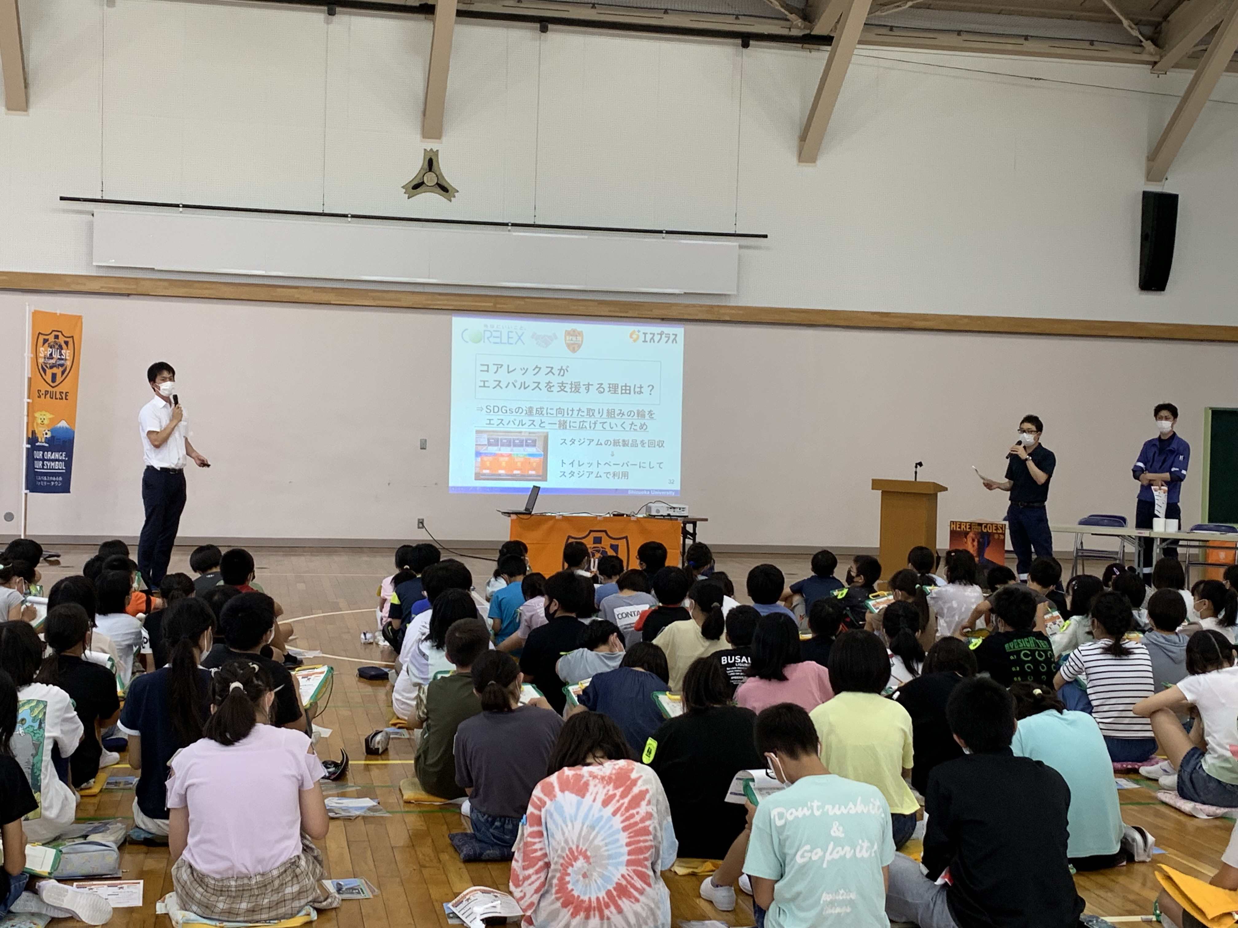 企業とのコラボレーション授業として開催した今回の『エスプラス』は、コアレックス信栄株式会社(富士市)にご協力いただき、同校の6年生105名を対象に『地域貢献や社会に出て必要なチカラを考えるキャリア教育授業 ~リサイクル企業編~』を実施しました。