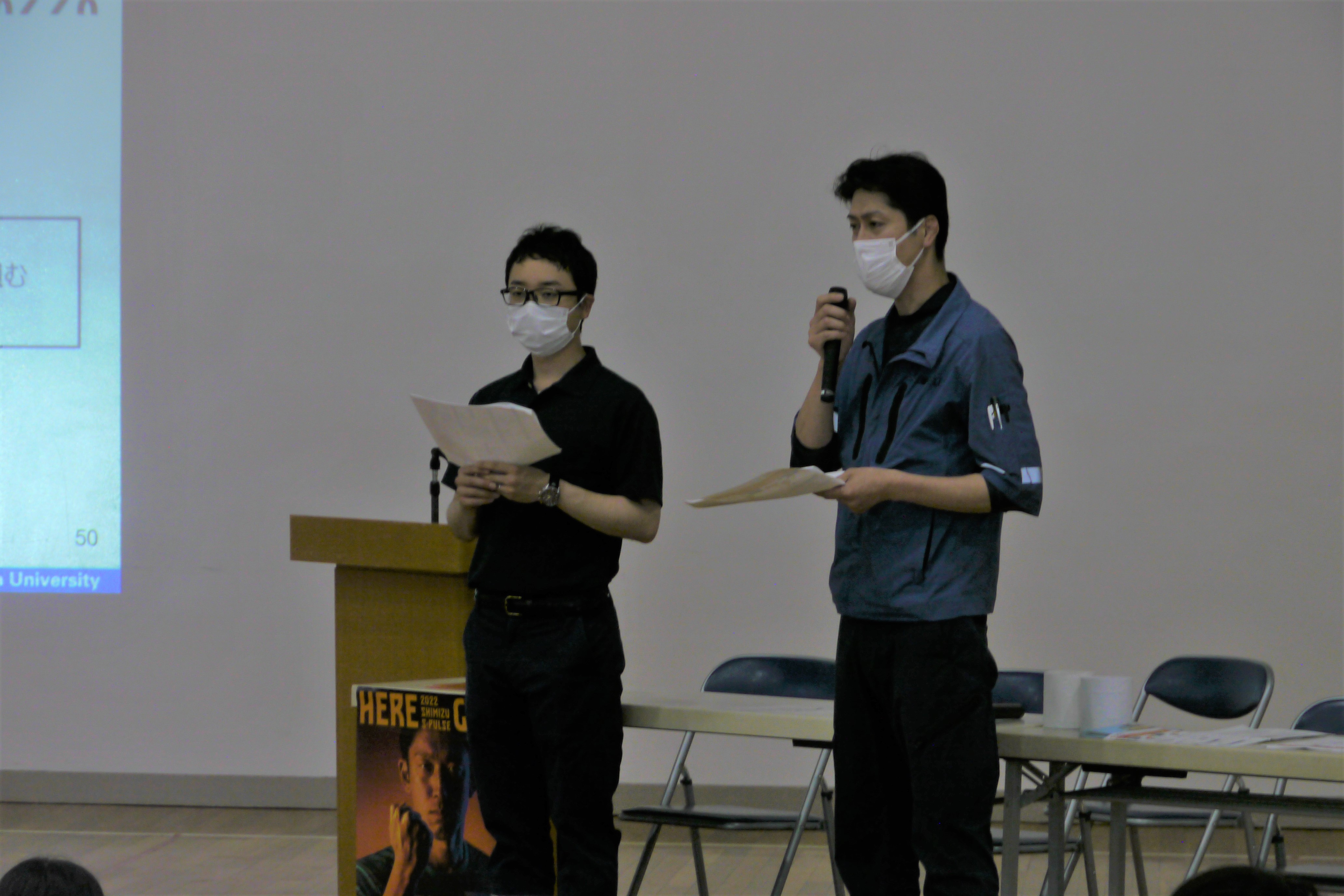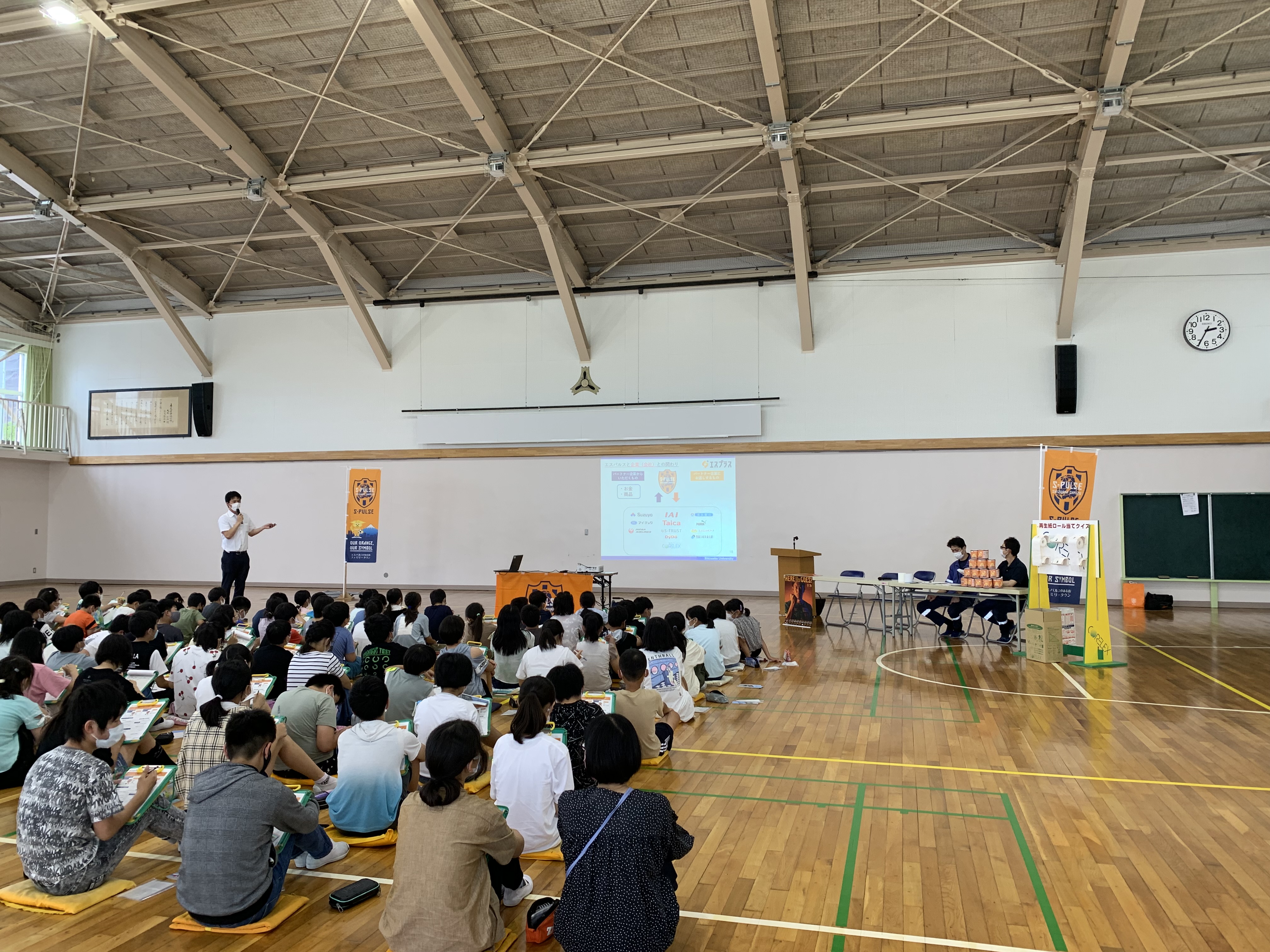 授業では、初めに「サッカーやエスパルスを通した地域(企業・市民)との関わりを考えよう」をテーマに、エスパルスとパートナー企業、地域にはどのようなつながりがあるのかを考えました。その後コアレックス信栄の宇佐美貴史さん、佐野二郎さんをゲスト講師に迎え、「地元企業で働くこと」「大人になって仕事をする時に必要なチカラ」について学びました。