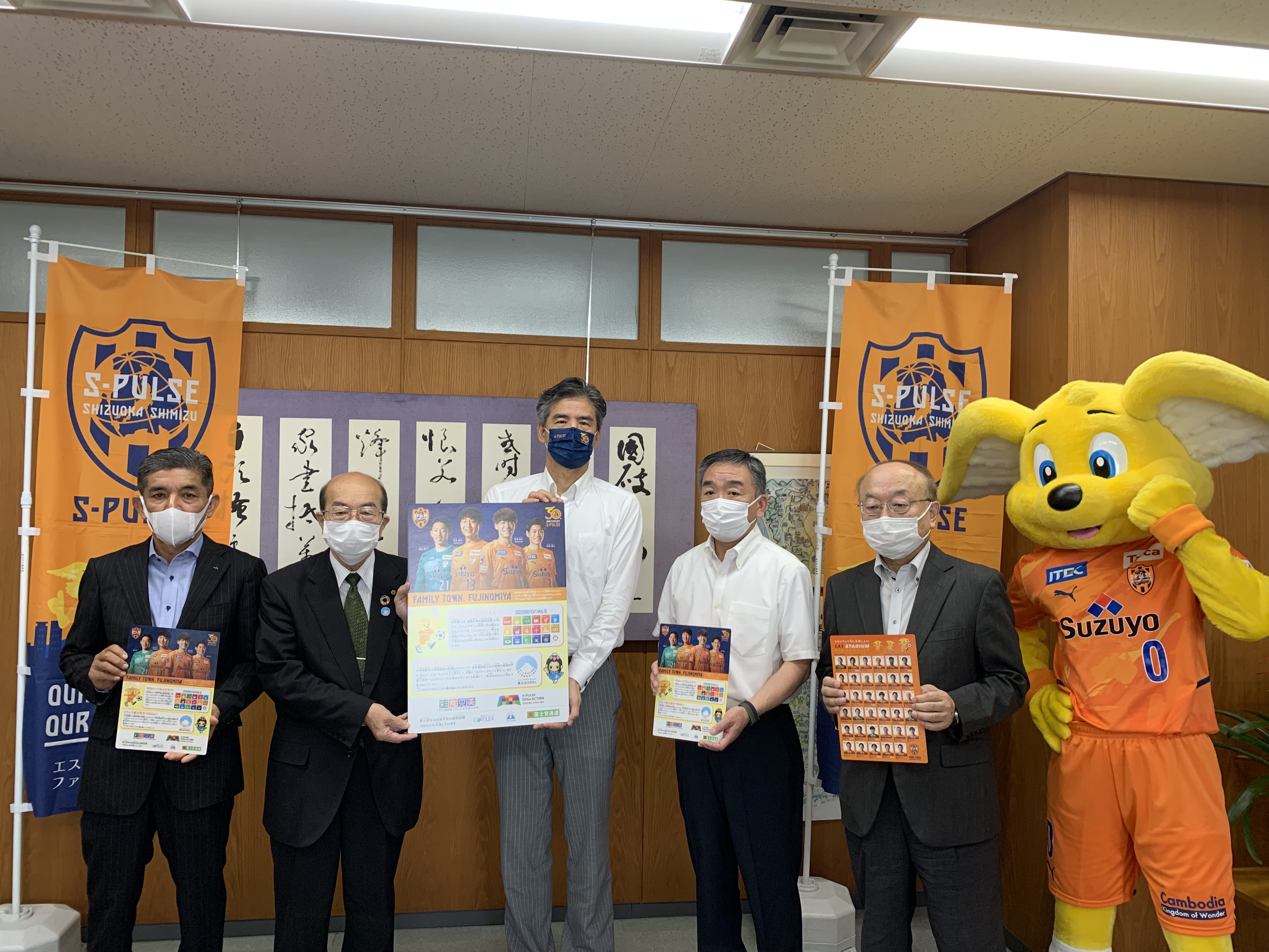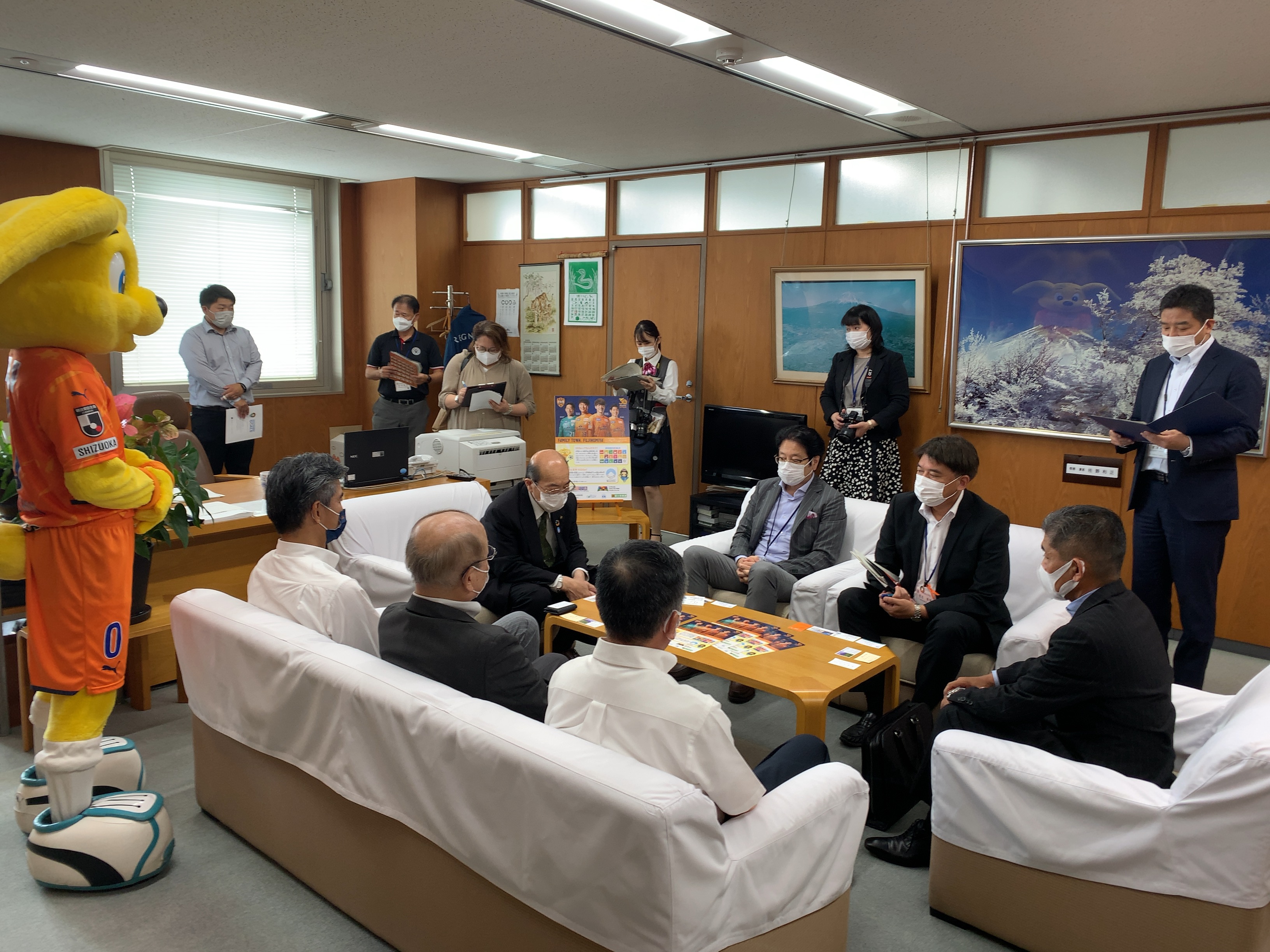 7月8日(金)富士宮市役所にて下敷きの贈呈式を実施し、株式会社エスパルス 代表取締役社長 山室晋也とオフィシャルマスコットのパルちゃんが参加しました。贈呈式にはご協賛いただいた企業の代表者様にもご出席いただき、富士宮市 池谷眞德 教育長へ下敷きの贈呈を行いました。