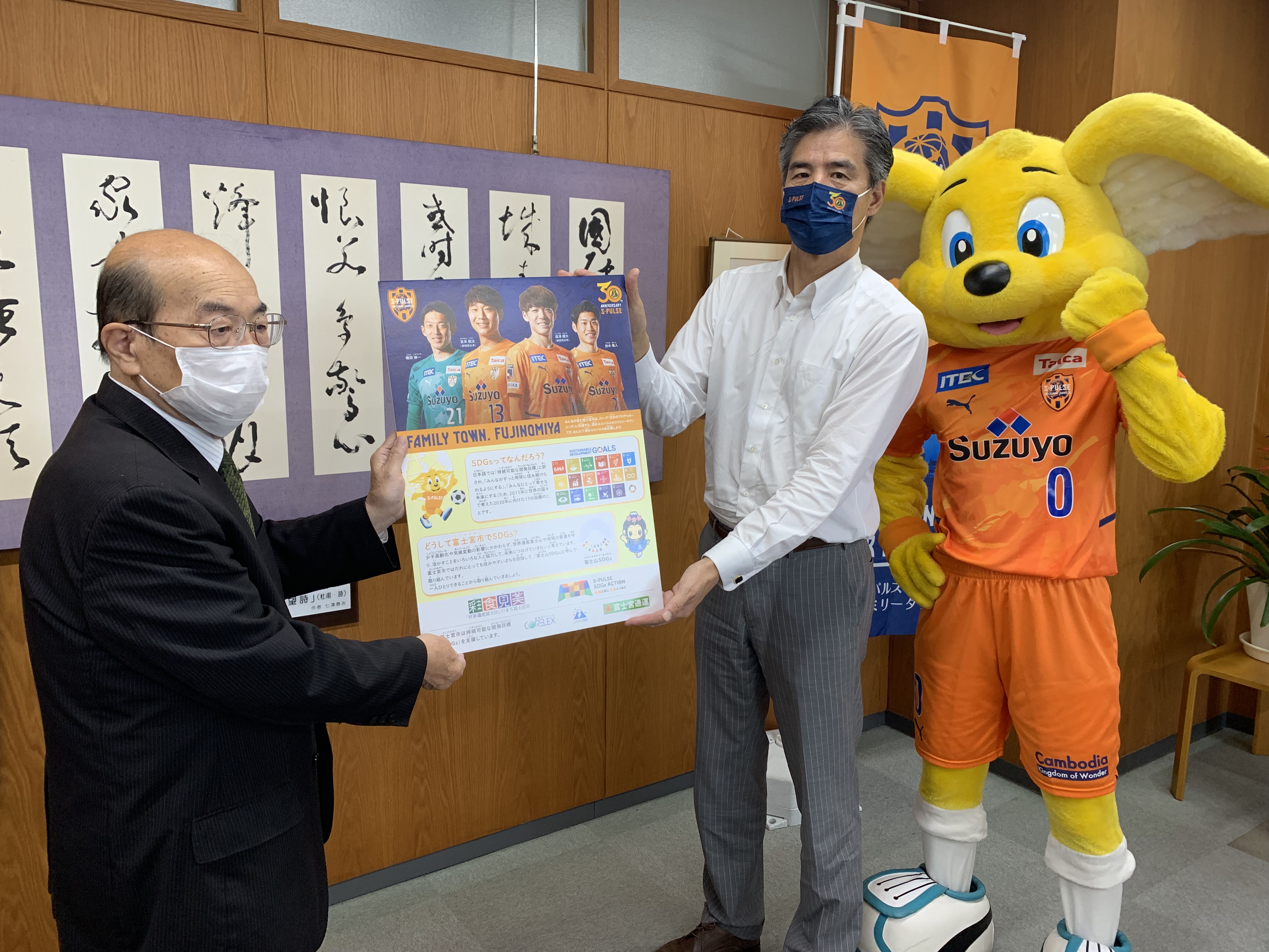山室社長は、「まずはこのような機会をいただき大変光栄に思います。昨年ファミリータウン協定を締結して以来、招待事業など様々な活動を進めさせていただいている中で、今回は富士宮市の小学生 約6,400名にご協賛いただきました企業様と共に下敷きを贈呈させていただくことになりました。SDGsについて子どもたちに理解いただき、また素晴らしい富士山のある富士宮市の環境を守り続けていくような活動にエスパルスが少しでもお役に立てることを嬉しく思います。今後もパートナー企業の皆様とこのような取り組みを継続させていただきたく思います。」とクラブの想いを伝えました。