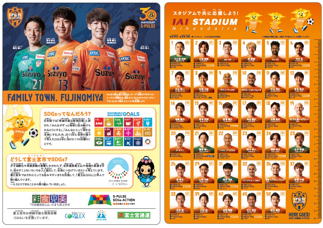 本事業は子どもたちにSDGsについて考えるきっかけをつくるとともに、クラブが取り組むスポーツ振興の一環として、地域愛の醸成、プロスポーツへの関心、心身の健全育成を目指すことを目的とし、下敷きの片面に富士宮市が推進する「富士山SDGs」を、もう片面にはエスパルスの選手一覧を掲載しています。