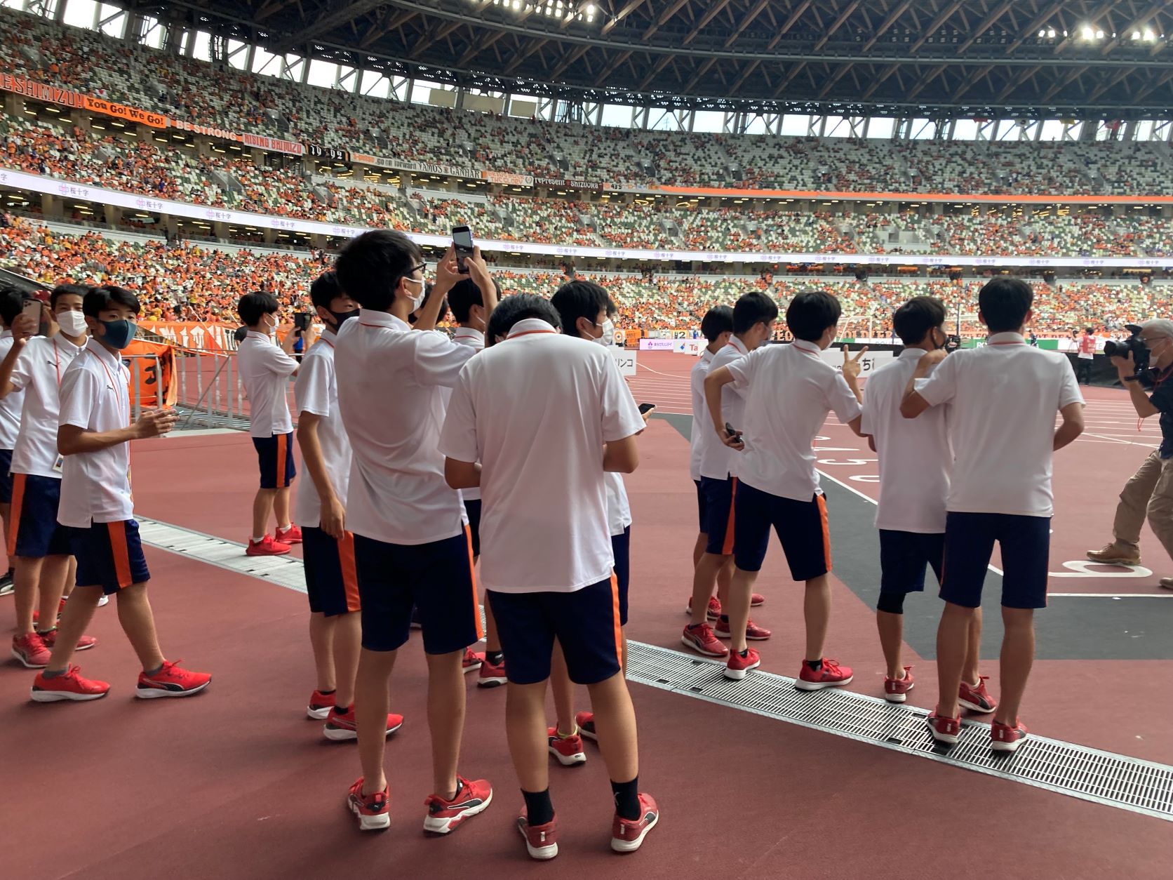 ボールパーソンを担当することになった3年生18名はスタジアムに入るなり、ピッチから見る風景をみて興奮と緊張が入り混じった様子。