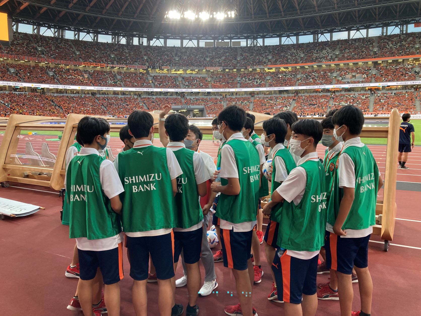実は、この日行われたJリーグ清水エスパルスvs 横浜F・マリノス戦のボールパーソンをSS榛原の選手が務めることとなり、チーム総動員!バスで静岡から乗り込みました。