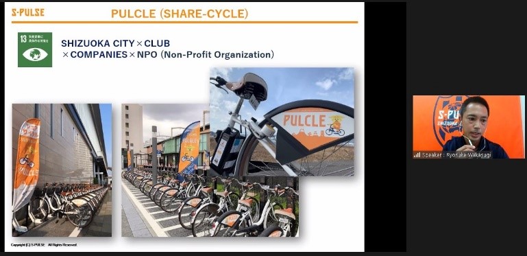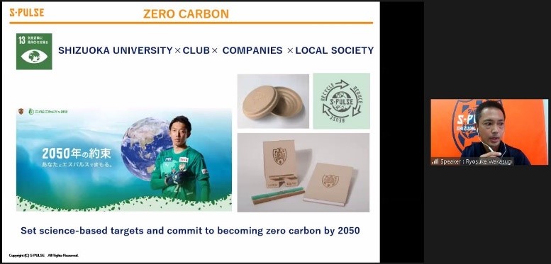 エスパルスはオープニング講演として、若者・企業・行政を巻き込んだSDGsの取り組みを話し、COOL CHOICE啓発やPULCLE、ゼロカーボンプロスポーツクラブ宣言、海洋プラごみ削減授業などを紹介しました。