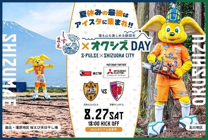 8月27日(土)に行われる明治安田生命J1リーグ第27節 京都サンガF.C.戦(15:30開場/18:00キックオフ)にて、静岡市とエスパルスのコラボ企画『海も山も楽しめる静岡市 しずまえ×オクシズDAY』を実施いたします。