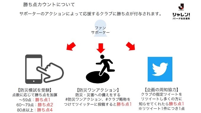 ソナエルJapan杯はサポーターのアクションによって応援するクラブに勝ち点が付与され、その合計得点で勝敗が決定します。勝ち点を獲得するアクションは以下の3つです。