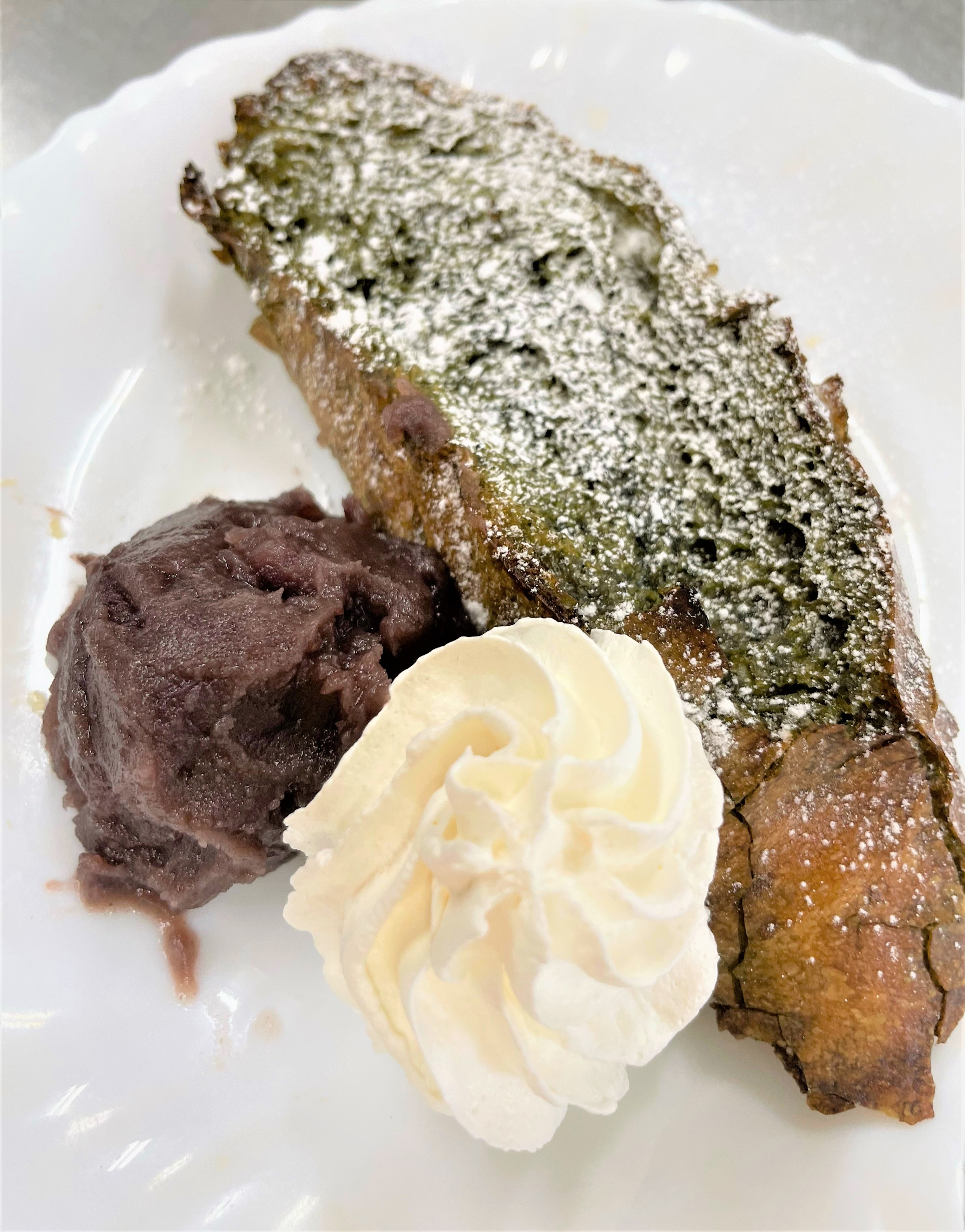 オクシズのお茶を使って焼いたトースト。お茶の香りとあんことクリームが