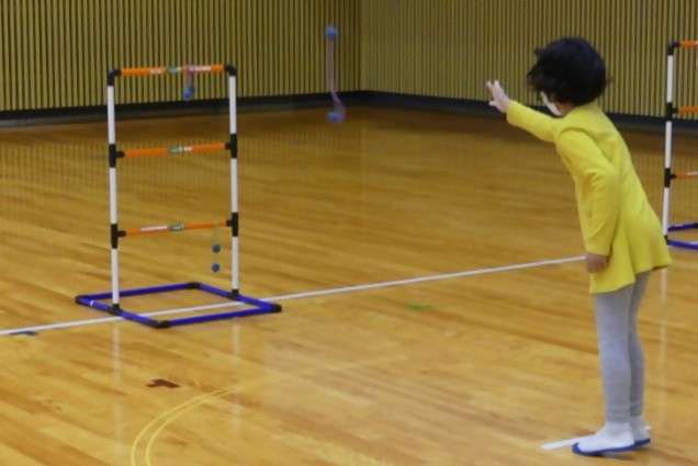 ②ラダーゲッター:ヒモでつながっている2個のボールをラダー(ハシゴ)に向かって投げ、ボールがラダーに引っ掛かると得点ゲット。合計点数を競います。