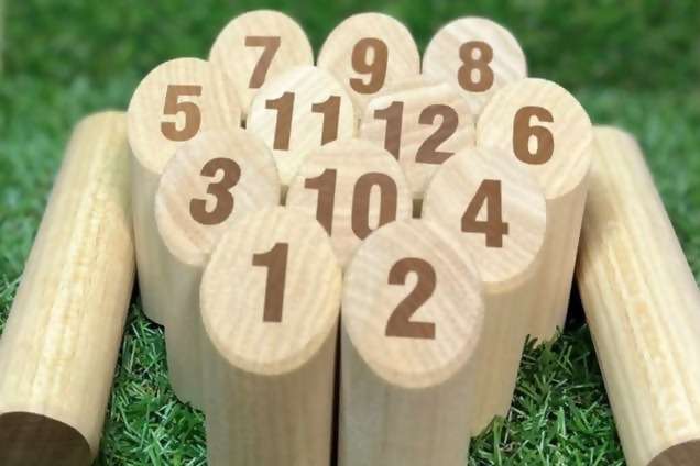 ①モルック:フィンランドで開発されたスポーツです。モルック(木の棒)を投げて、点数の書かれたスキットル(木のピン)を倒し、ちょうど50点になった人の勝ちです。