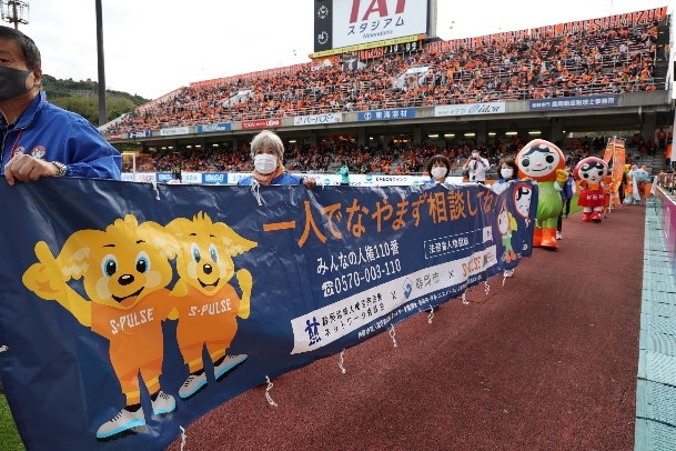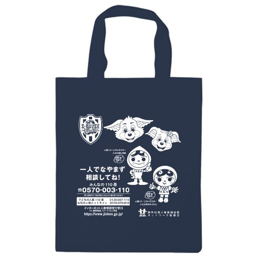 『人権相談ダイヤル』のPRとして、人権相談ダイヤルの案内がプリントされた『エスパルスディープシーブルーコラボトートバック』を配布します。また、ハーフタイムには人KENまもる君たちがバナーをもってピッチを回ります!