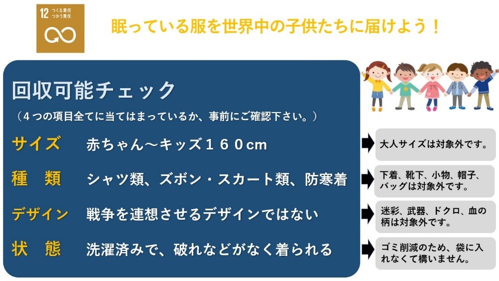 世界には約8,000万人以上の人が、命の危険があることから、住んでいる家や地域を追われ生活を送っています。そしてその半数は「こどもたち」なのです。「安心、安全な生活を送るために必要不可欠な服を必要としているこどもたちに届けたい!」という想いから私たち東海大学付属静岡翔洋高校では、高校生が主体となって保護者や地域の方々に呼びかけて子供服の回収活動を行っています。