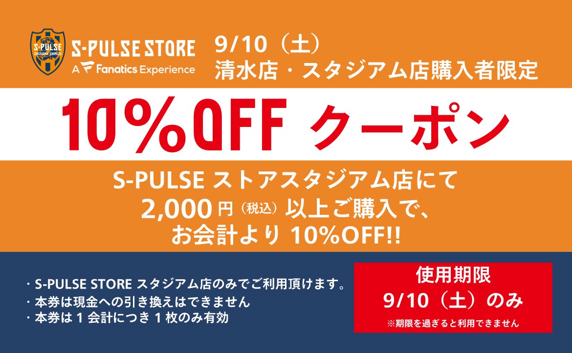 9月10日(土)S-PULSE STORE清水店で2,000円(税込)以上ご購入いただいたお客様に、9月10日(土)当日のみスタジアム店で使用できる「2,000円(税込)以上ご購入でお会計10%OFFクーポン」を配布いたします。