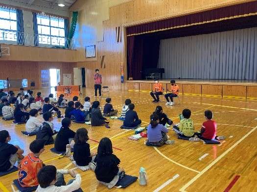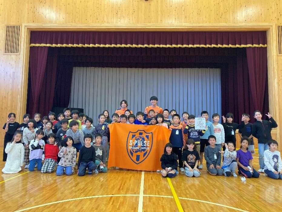 11月10(木)髙橋大悟選手、梅田透吾選手がファミリータウン富士市にある富士市立富士川第二小中一貫校(3年生52名、5年生50名)を訪れ、交流を深めました。今回の学校訪問は、8月20日(土)の柏レイソル戦で実施した、ホームゲーム招待企画『静岡県ファミリータウン小学生招待事業』の、申し込み御礼と子どもたちにエスパルスを身近に感じてもらうことを目的として開催されました。