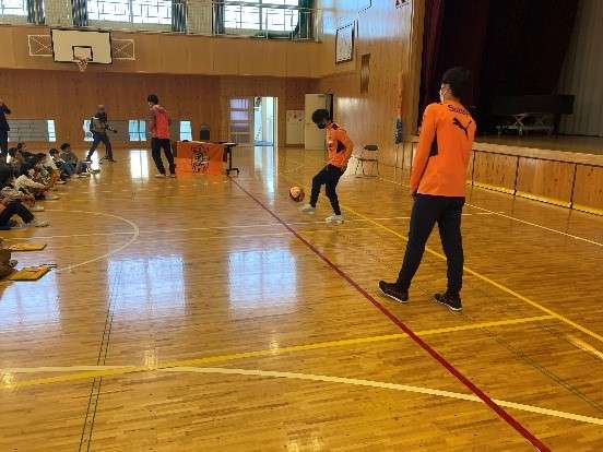 まず両選手が自己紹介し、リフティングパスで華麗な足技を披露しました。また、代表児童とパス交換やリフティングパスを行い、プロ選手のパスを受けた子どもたちはとても嬉しそうな表情を浮かべていました。その後、先生からの質問に答える対談形式で、自身の小学生の時の様子やプロになるまでの道のりについて振り返りました。