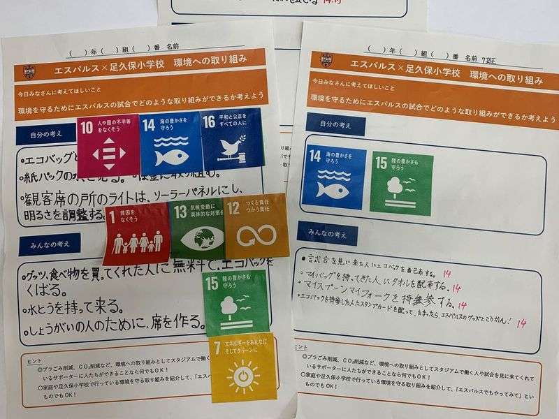 試合当日のスタジアムの様子についての映像を見た後に、試合を見に来ている人(自分たち)やエスパルスが環境を守るためにどんなことができるかをグループで話し合い、子どもたちからは、マイバック・マイ水筒を持ってくる、照明をソーラーパネルにして明るさを調整する、デーゲームを増やす、車を使わずに電車・バス・自転車を使う、エコバッグを来てくれた人にプレゼントする、SDGsをアピールするために大きな看板を掲示するなどたくさんのアイデアが出ました。またそれぞれがどのSDGsに関連するかについてもしっかり考えていました。小学生の目線で環境問題やSDGsについて考え、自分たちにできることを積極的に行うことや、学んだ知識を多くの人に伝えて問題解決への動きを広めて行くことの大切さについて理解を深めたようでした。