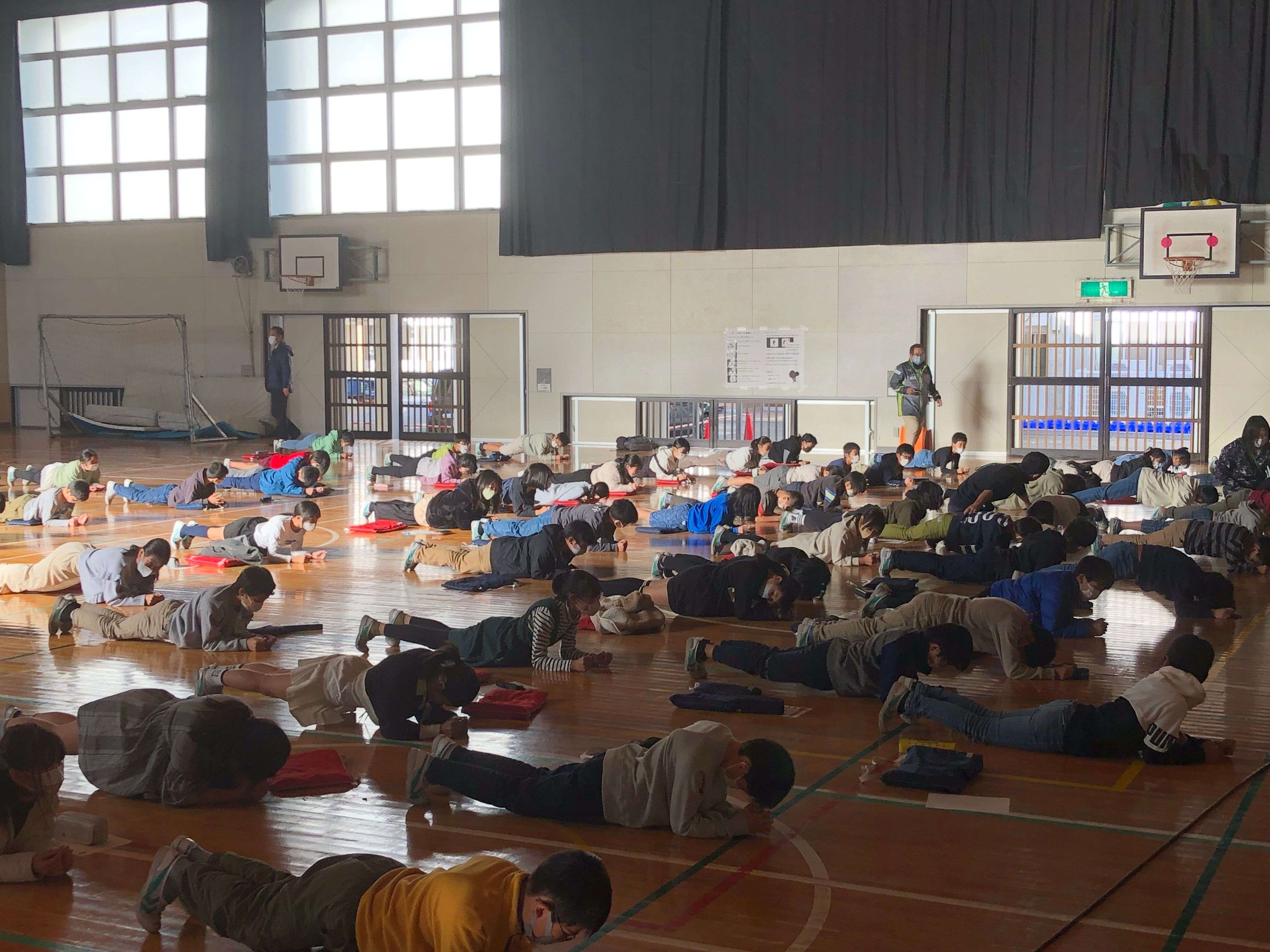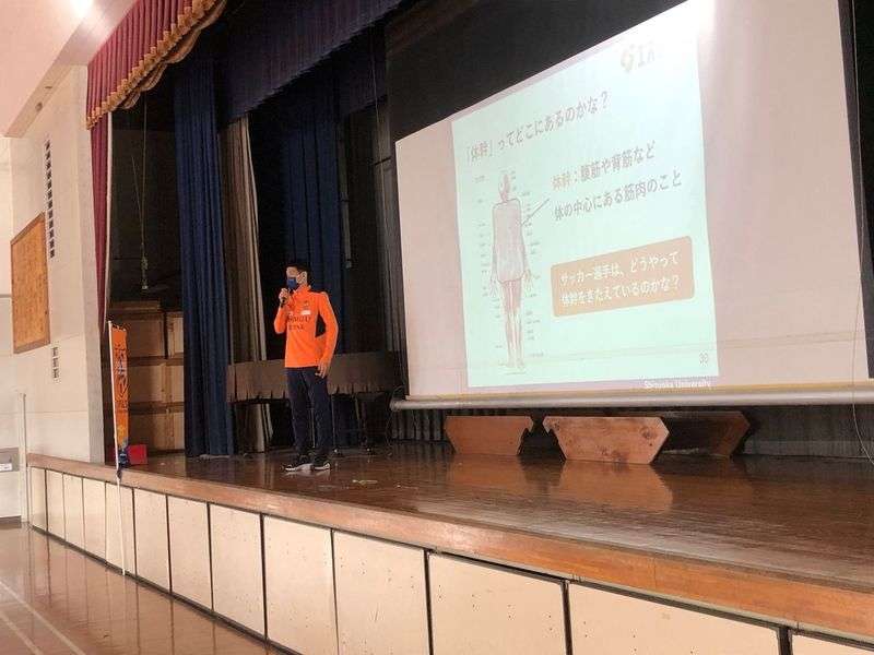 次に、「シュートと理科の関係」では、プロ選手のように速いシュートを打つための『関節』『筋肉』などの体の作りや動き方について学びました。片山選手からはサッカー選手として活躍するためには、「体幹をトレーニングして鍛えることが大切」と話があり、片山選手が普段行っているトレーニングに全員で挑戦しました。