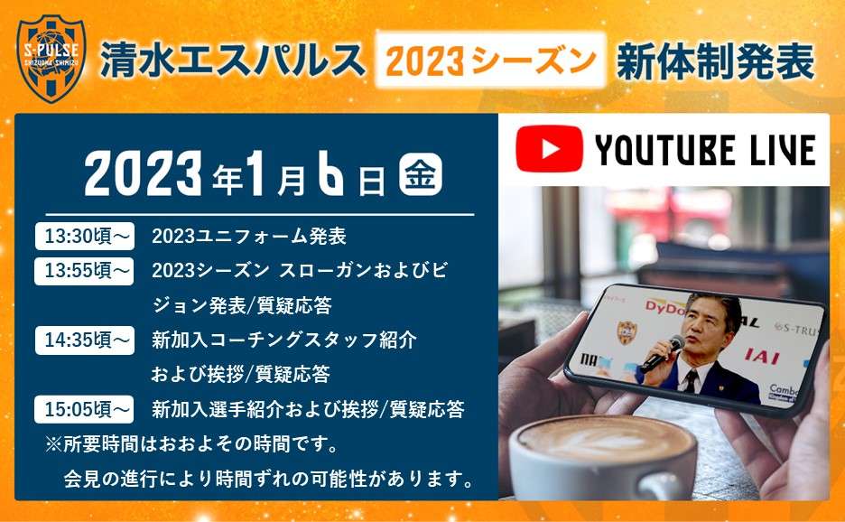 エスパルスは、1 月6 日(金)に行われる2023 新体制発表記者会見において、YouTube ライブ配信を実施しますので、下記の通りお知らせいたします。
