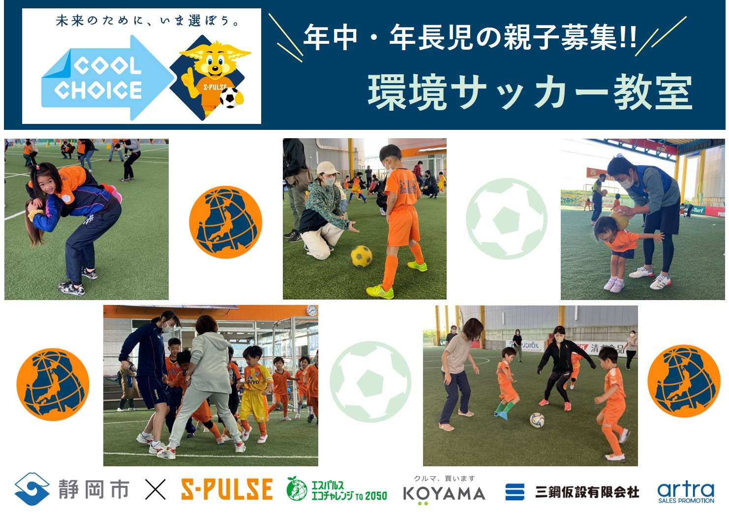 エスパルスは静岡市と連携して、地元企業3社様のご協力のもと、環境省が推進する地球温暖化対策に資する賢い選択「COOL CHOICE(クールチョイス)」普及啓発事業に取り組んでいます。本事業の一環として、「COOL CHOICE環境サッカー教室」を開催し、参加者を募集いたしますので、以下の通りお知らせします。たくさんのご応募お待ちしております!