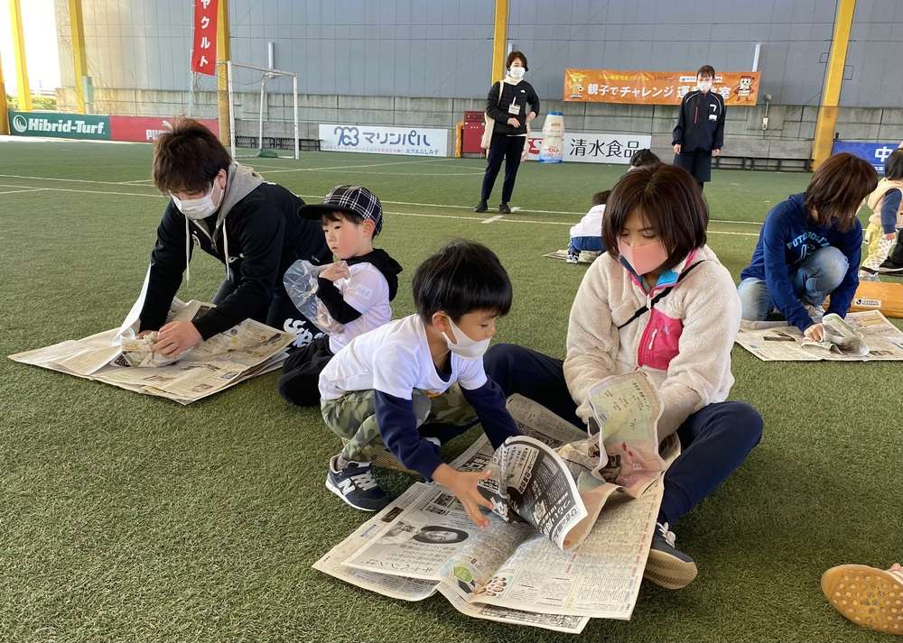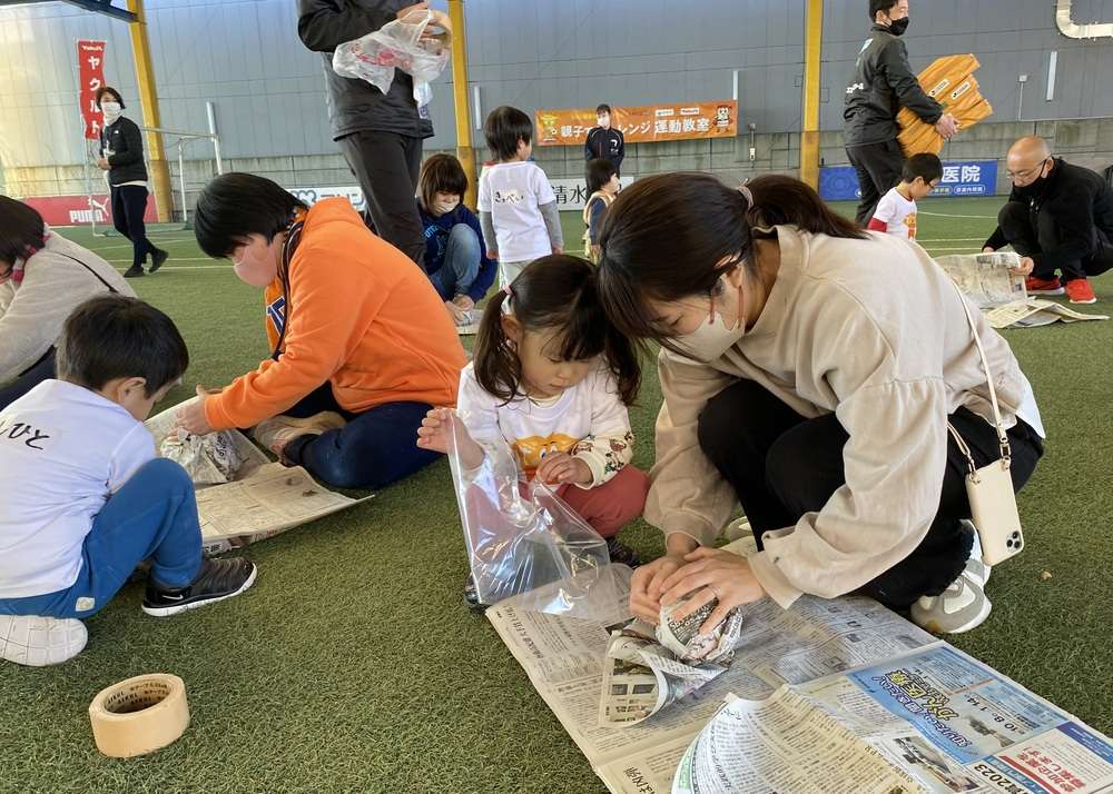 親子で新聞紙を丸めてサッカーボール作りにチャレンジします。手先を使ってモノを作る「工作」は子どもの成長には欠かせない重要な要素の1つとなります。工作を取り入れることで子供たちの好奇心に刺激を与え、集中力を高めます。