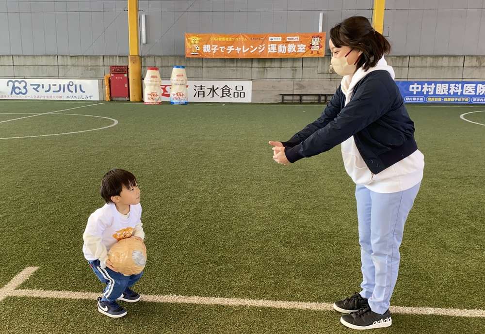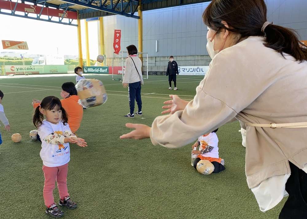 作ったボールを「なげる」・「とる」といった動作を必要とするキャッチボールや、ボールを「ける」・「わたす」動作が主となるシュート練習などを行います。最後はボールを使ったサッカー対決を親子で実施し、ゲーム形式の中で楽しく運動する機会を創出します。