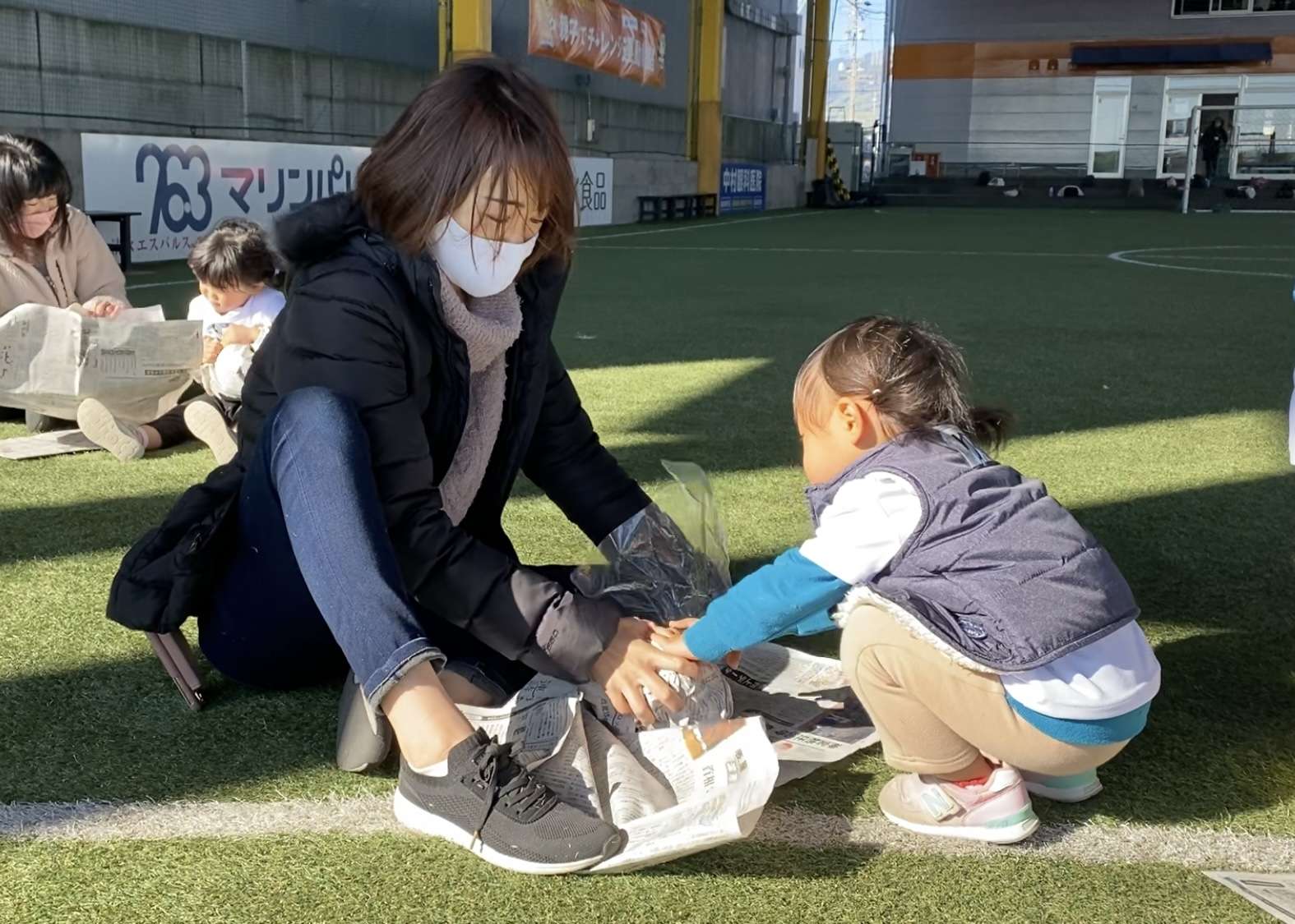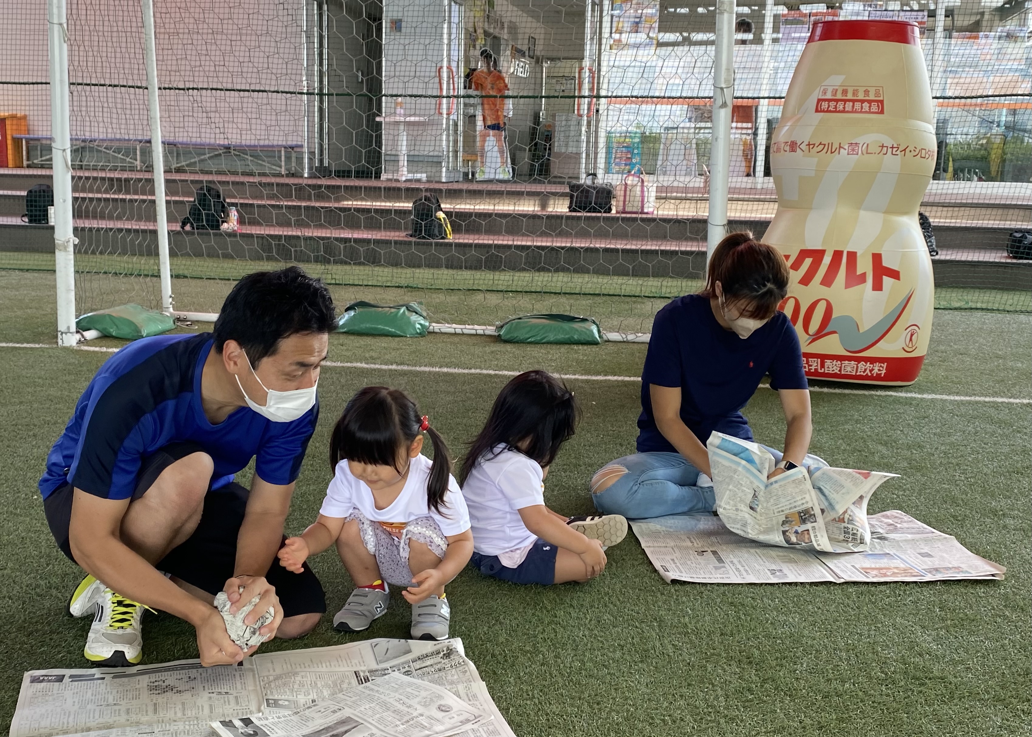 親子で新聞紙を丸めてサッカーボール作りにチャレンジします。手先を使ってモノを作る「工作」は子どもの成長には欠かせない重要な要素の1つとなります。工作を取り入れることで子供たちの好奇心に刺激を与え、集中力を高めます。