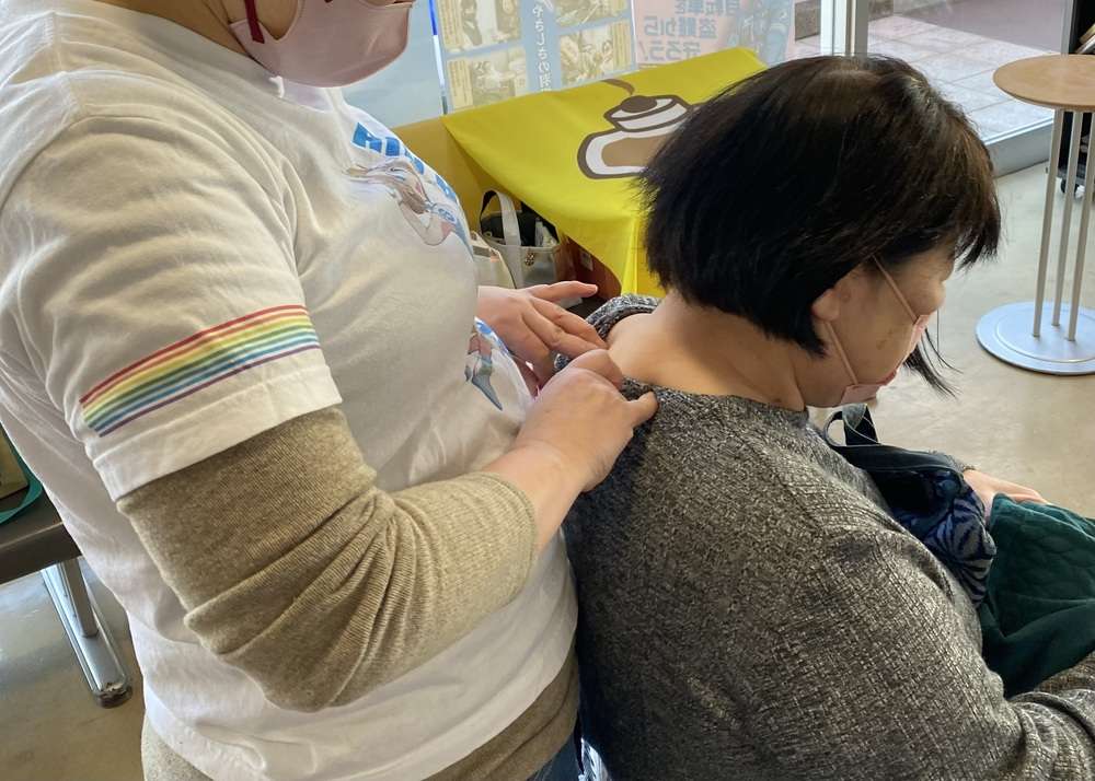 家庭用のセルフケア商品「こりスポッと」を使って、コリが気になる部位のツボに貼る「ツボ刺激体験」。丸いシールに小さな樹脂の粒が付いており、鍼のように刺さったりしないタイプなので、金属アレルギーの方や、鍼が苦手な方にも抵抗なく体験いただくことができました。参加者の皆さんは、それぞれコリが気になる部位に、運動の前や後に「ツボ刺激」体験をしていただき、セイリンの鍼灸商品の効果を実感いただきました。