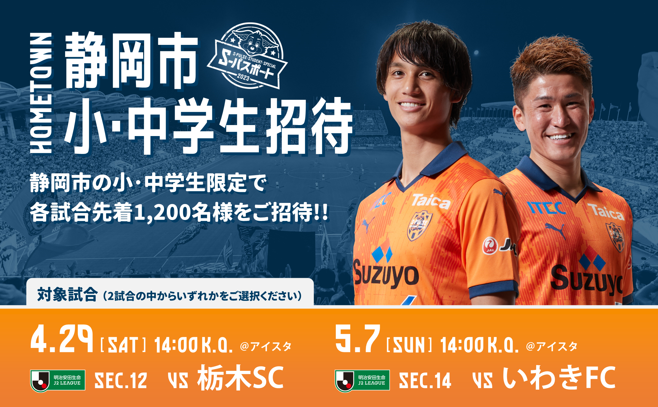 エスパルスは、静岡市内の小学校・中学校に通う児童・生徒と保護者の皆様を対象に、ホームゲームへの招待企画を実施しますので、下記の通りお知らせします。