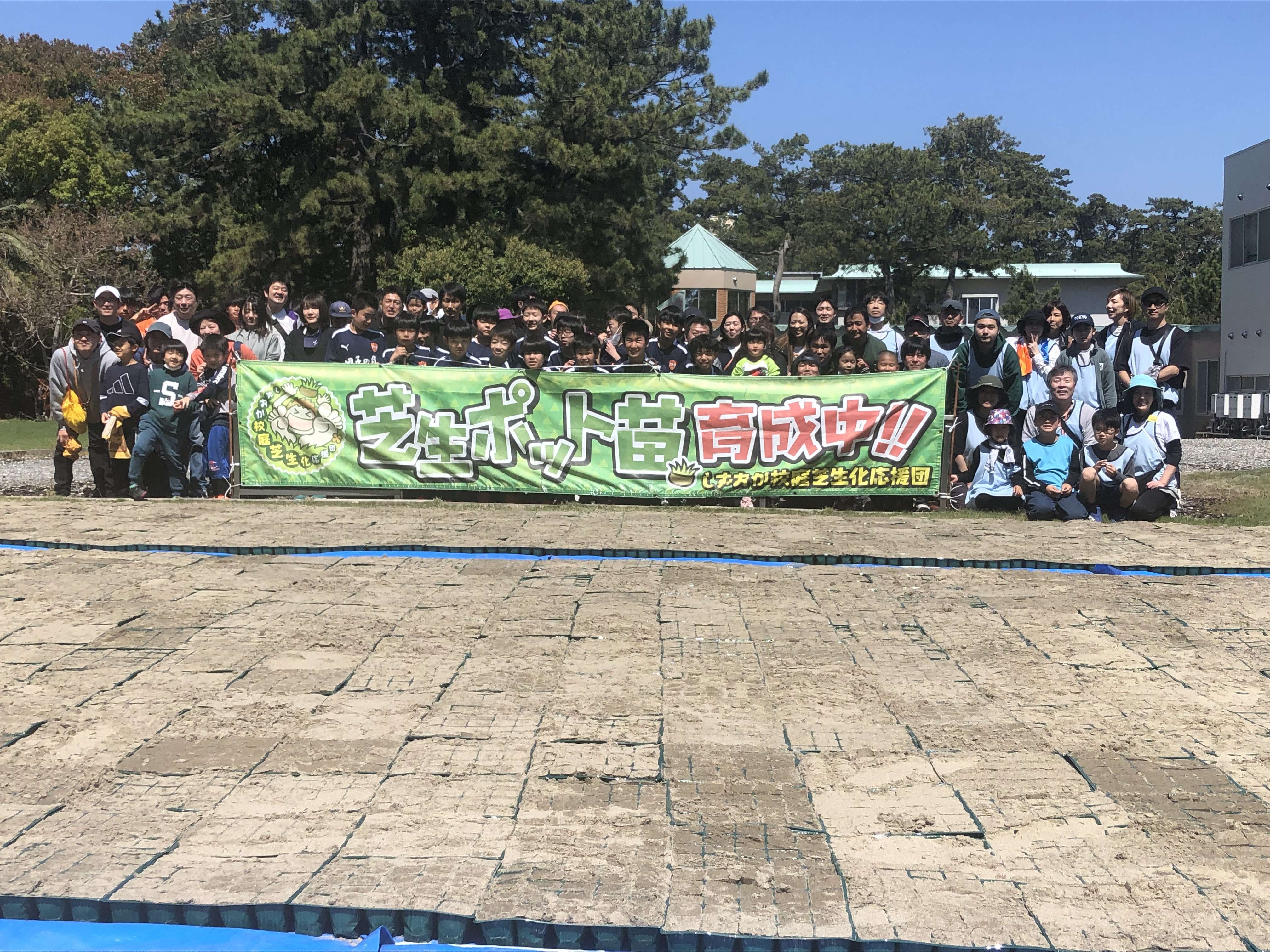 『ポット苗』とは、エスパルスの選手が日ごろ練習で使用している三保グラウンドの整備作業の際に出る小さな芝生の株と土を入れたもので、このポット苗を利用しての芝生化は、従来の方式よりも比較的安価で簡単にできるというメリットがあり、2009年から始まった『しずおか校庭芝生化応援団』ではこれまでに約60ヶ所の県内のグラウンド芝生化を達成しました。