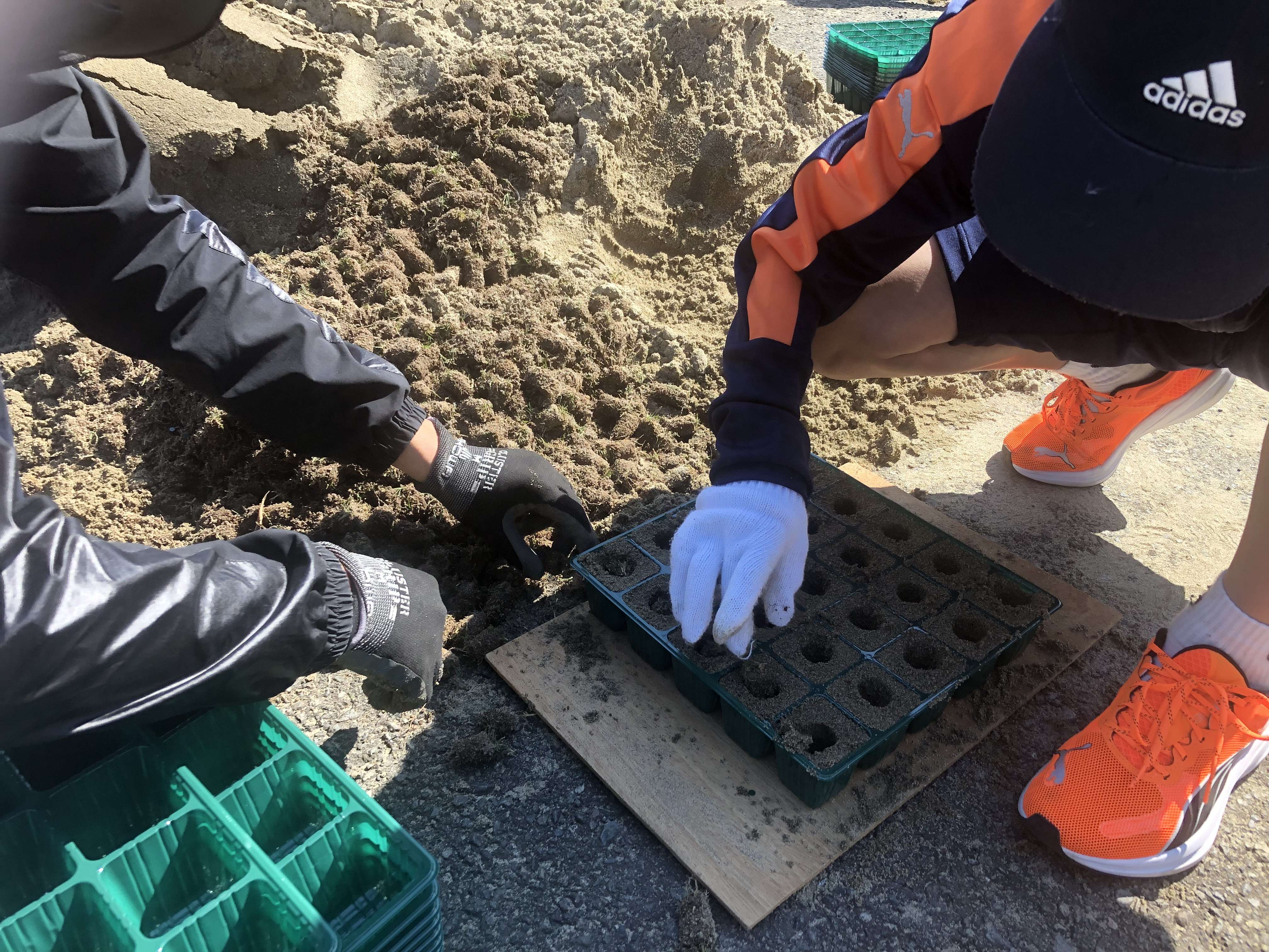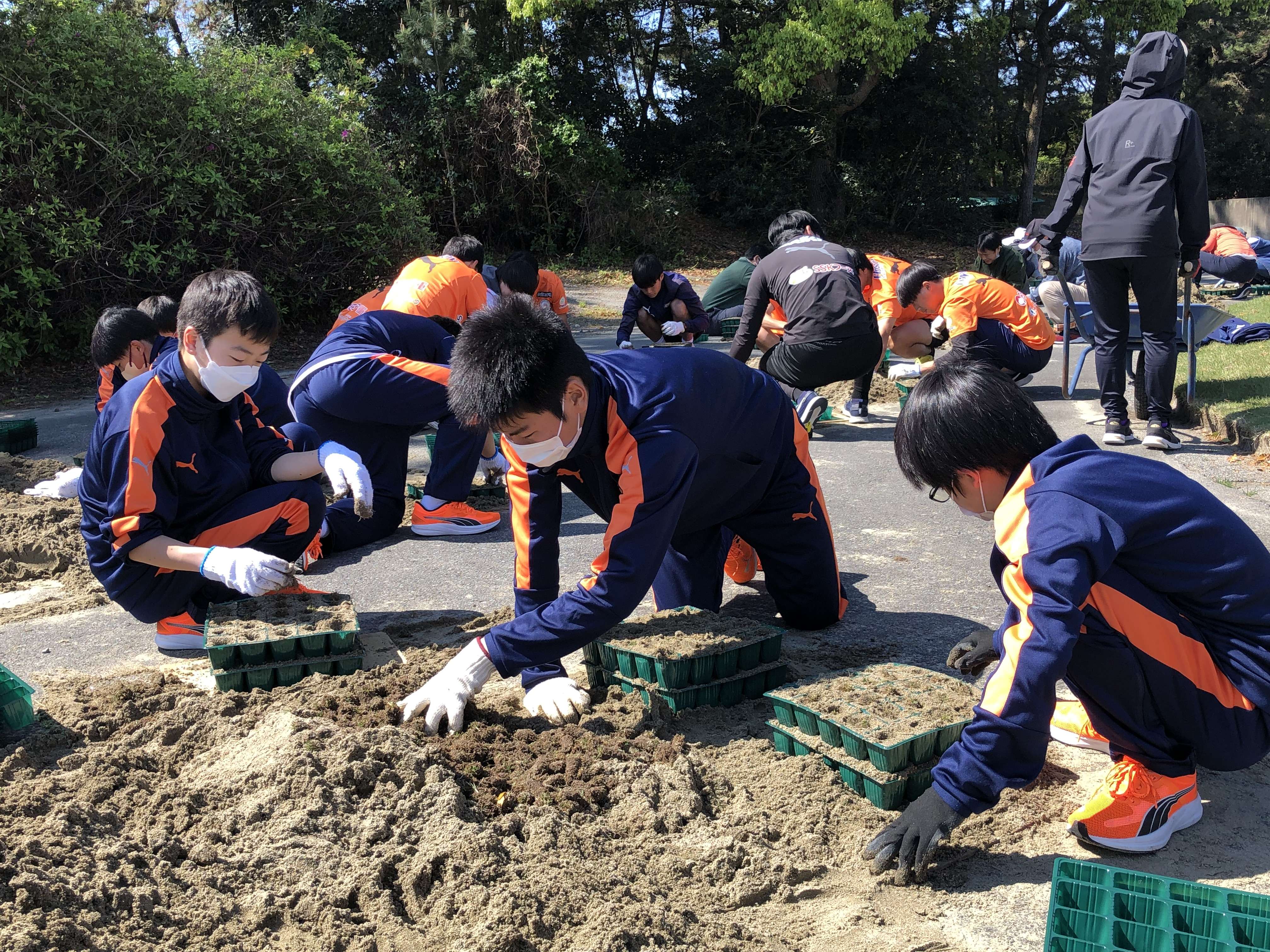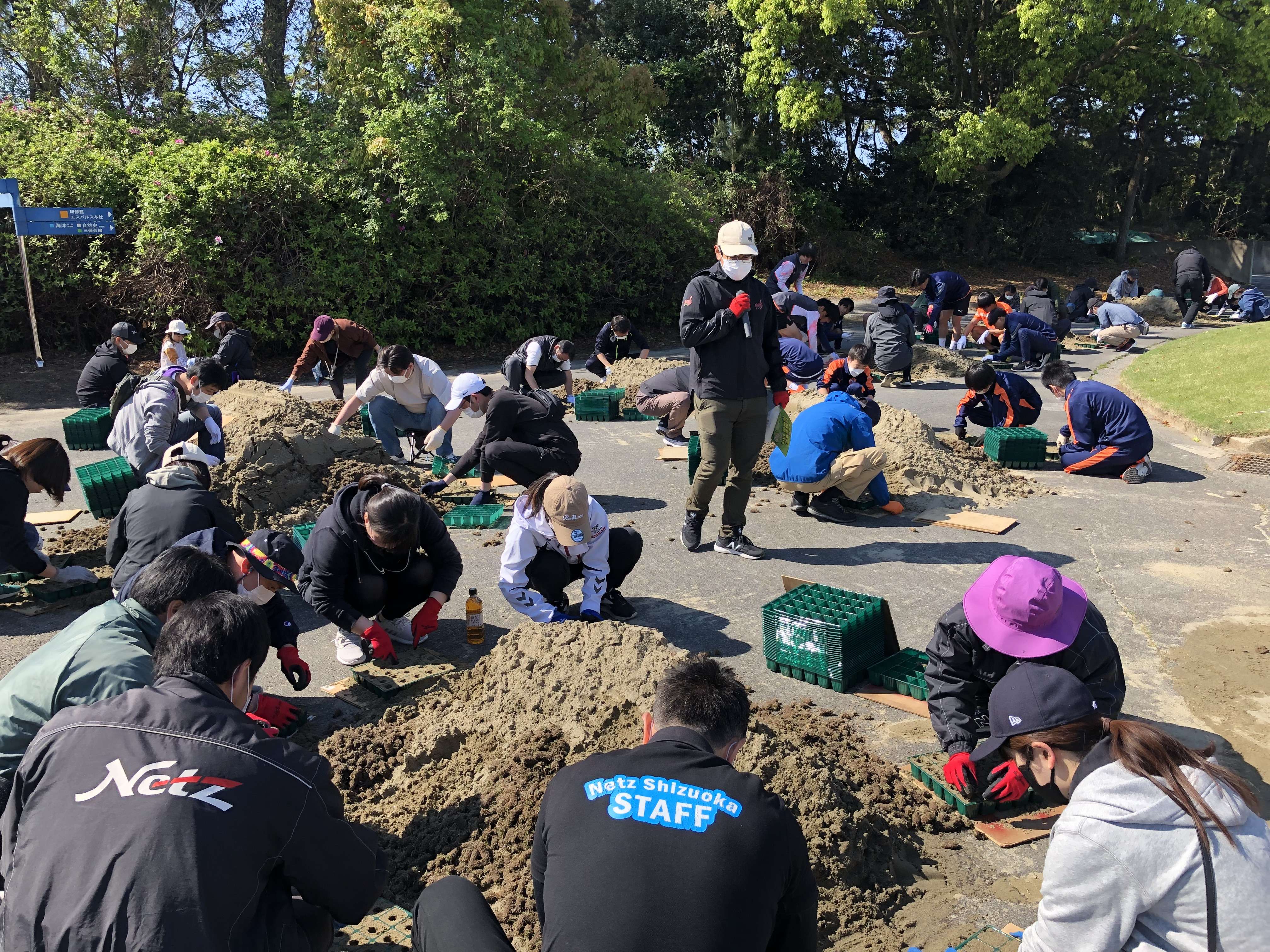 4月9日(日)、エスパルス三保グラウンド横のエスパルスドリームガーデンにて、2023年度の芝生ポット苗作りを行ないました。前日の強風が心配される中、好天に恵まれ、芝生化を必要とする学校や施設のために今年も各方面から総勢120名を超える参加者のご協力で実施されました。