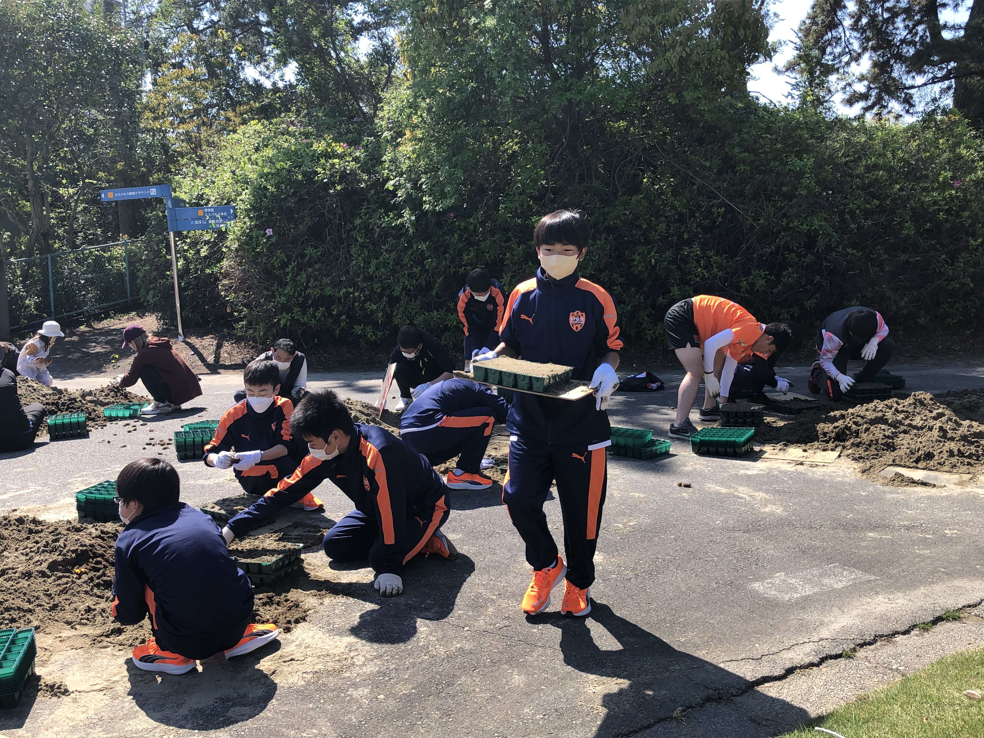 当日は、NPOグラウンドキーパーズの皆さまを中心に芝生化に取り組む施設の関係者・利用者、しずおか校庭芝生化応援団関係者が参加。エスパルスSS富士を始め、エスパルス社員も微力ながらお手伝いさせていただきした。目標の35,000株のポット苗を作成し6月上旬頃までこの場所で育生させた後、県内の芝生化を目指す6施設の土のグラウンドに植付けを行ないます。植付けから約1ヶ月でしっかりと根を張り、8月下旬頃には緑のきれいな芝生のグラウンドが完成します!