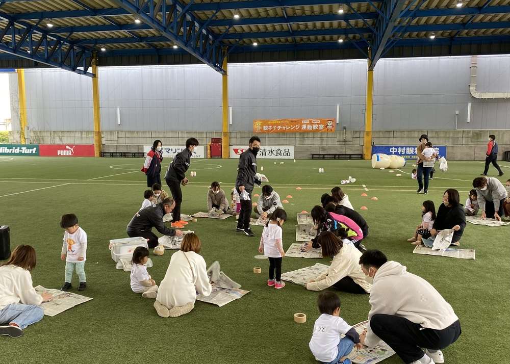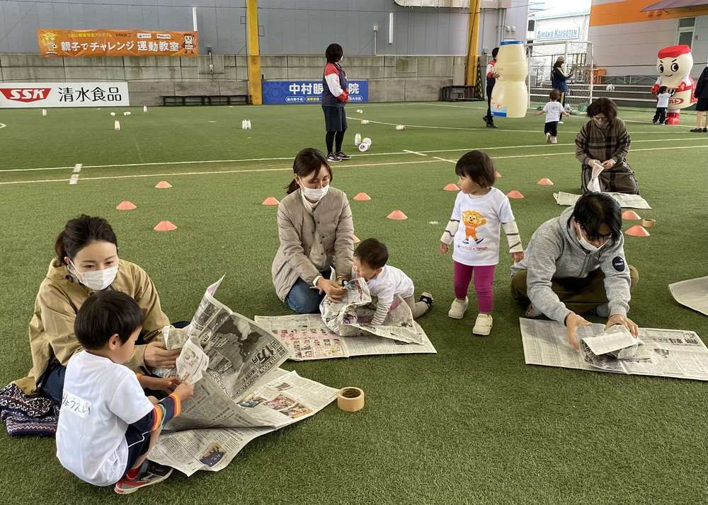 親子で新聞紙を丸めてサッカーボール作りにチャレンジします。手先を使ってモノを作る「工作」は子どもの成長には欠かせない重要な要素の1つとなります。工作を取り入れることで子供たちの好奇心に刺激を与え、集中力を高めます。