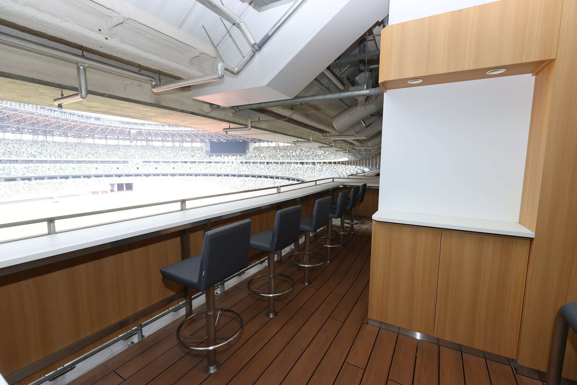 並んだカウンター席と専用テラスを最大6名でお使いいただけます。バックスタンド2層の最上部に位置しています。ゆったりした空間の中で、グループやご家族で観戦ができます。長いカウンターにスタジアムグルメを並べて楽しんでください。荷物が多くても安心です。