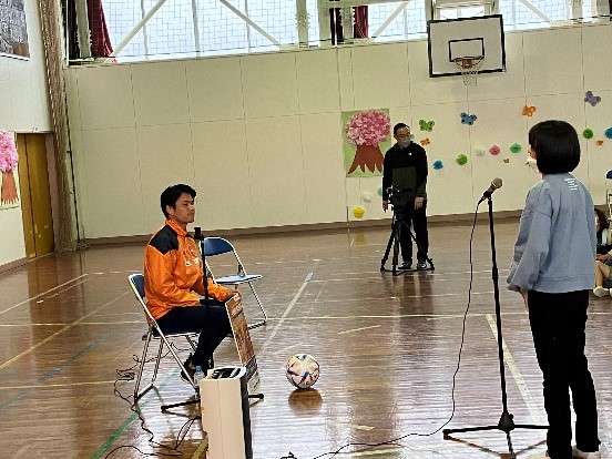 児童からサッカーをうまくなるコツにいついて聞かれると、「日々の練習の中で、まずは楽しむことが一番大事だと思っている」と話し、「チームメイトはライバルであり、仲間である」と仲間と切磋琢磨して成長していることについて話してくれました。「好きな食べ物は」「好きな遊びは」など小学生らしい質問にも笑顔で答え、岸本選手から子供たちへ質問する場面も多く見られました。