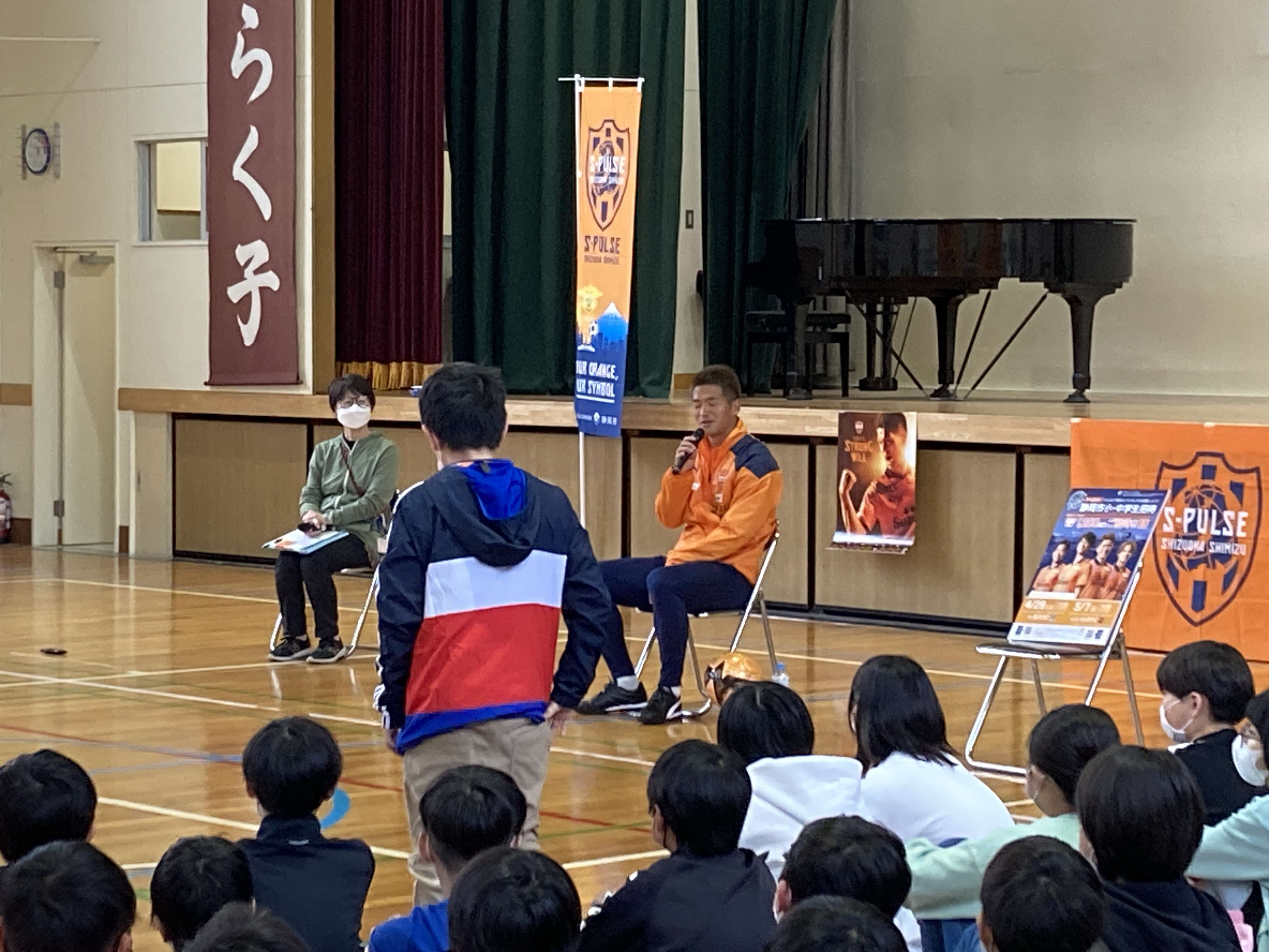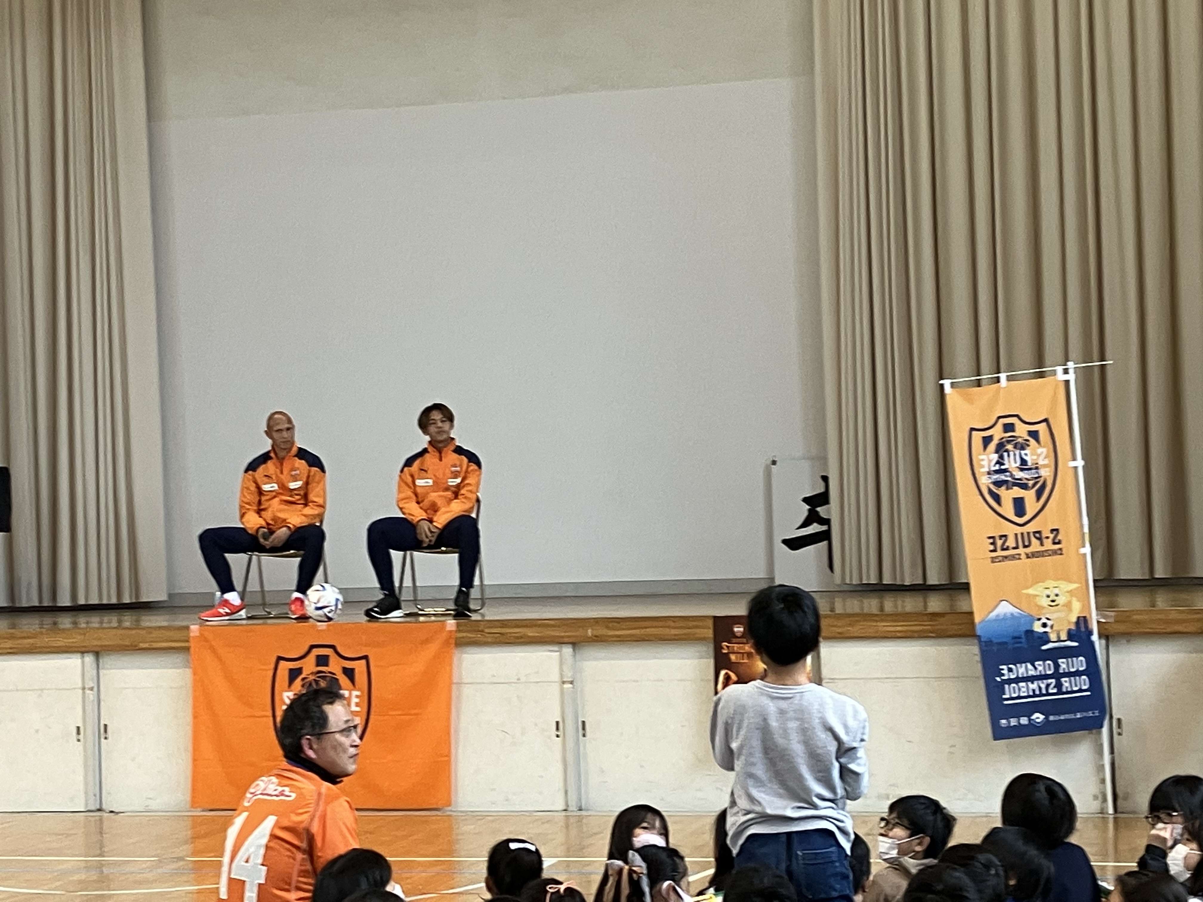 4月25日(火)と4月26日(水)にエスパルスが静岡市との交流事業の一環として実施するホームゲーム招待企画『静岡市小・中学生招待事業』のお申し込み御礼と子どもたちにエスパルスを身近に感じてもらうことを目的として、北川航也選手が静岡市立西奈小学校(5,6年生237名)を、ディサロ燦シルヴァーノ選手、菊地脩太選手が静岡市立賤機南小学校(5,6年生194名)を訪れ、交流を深めました。