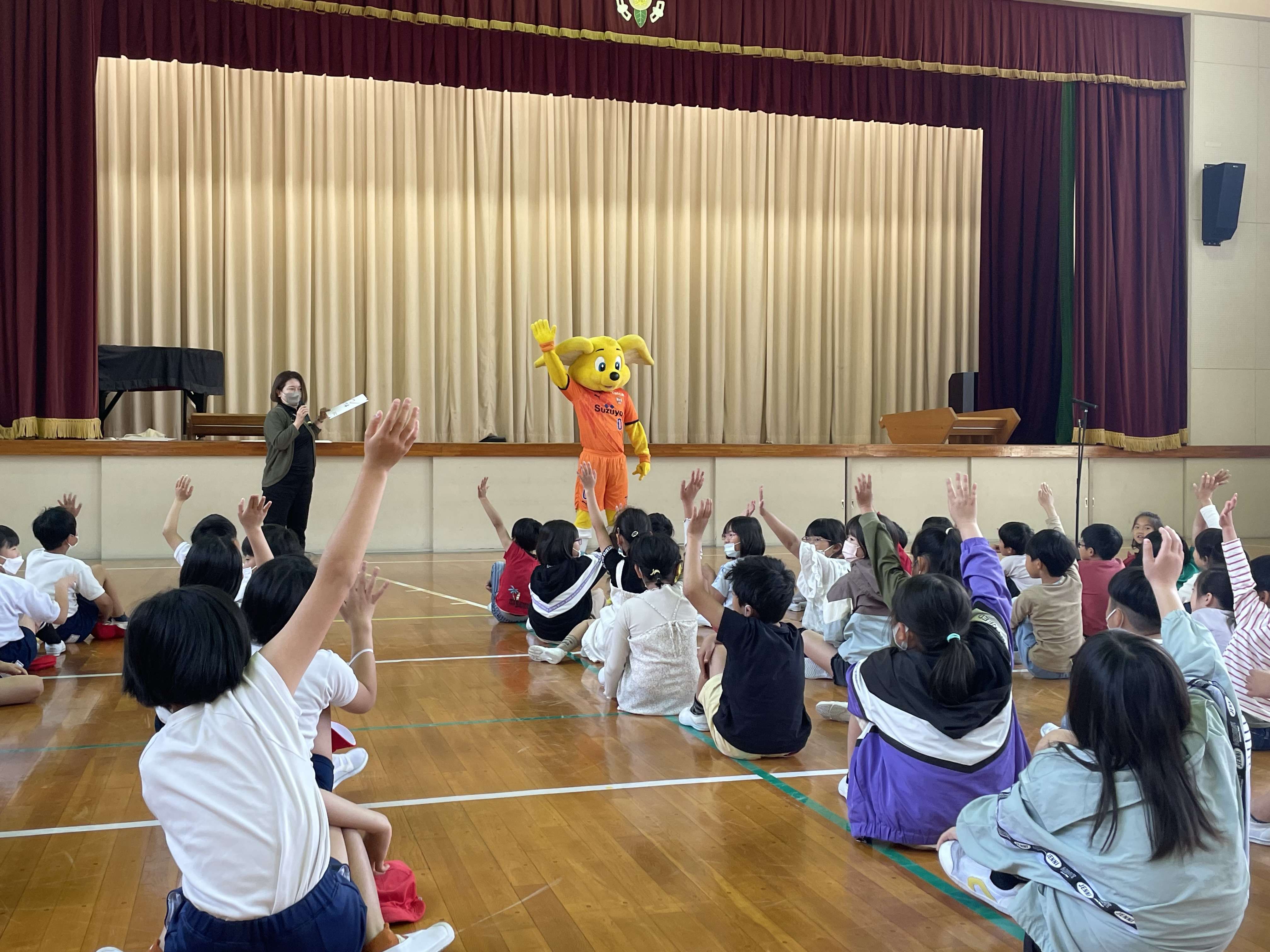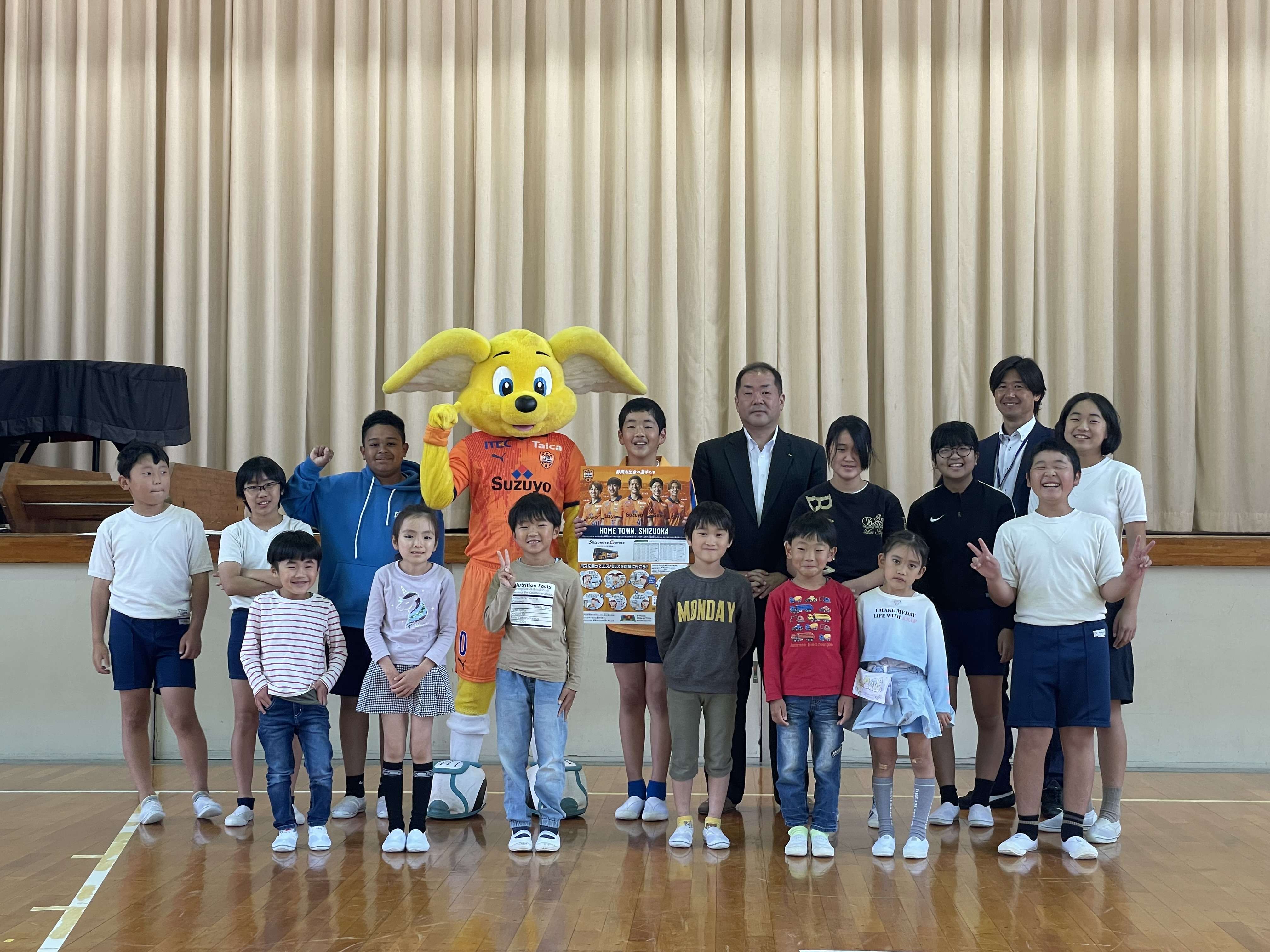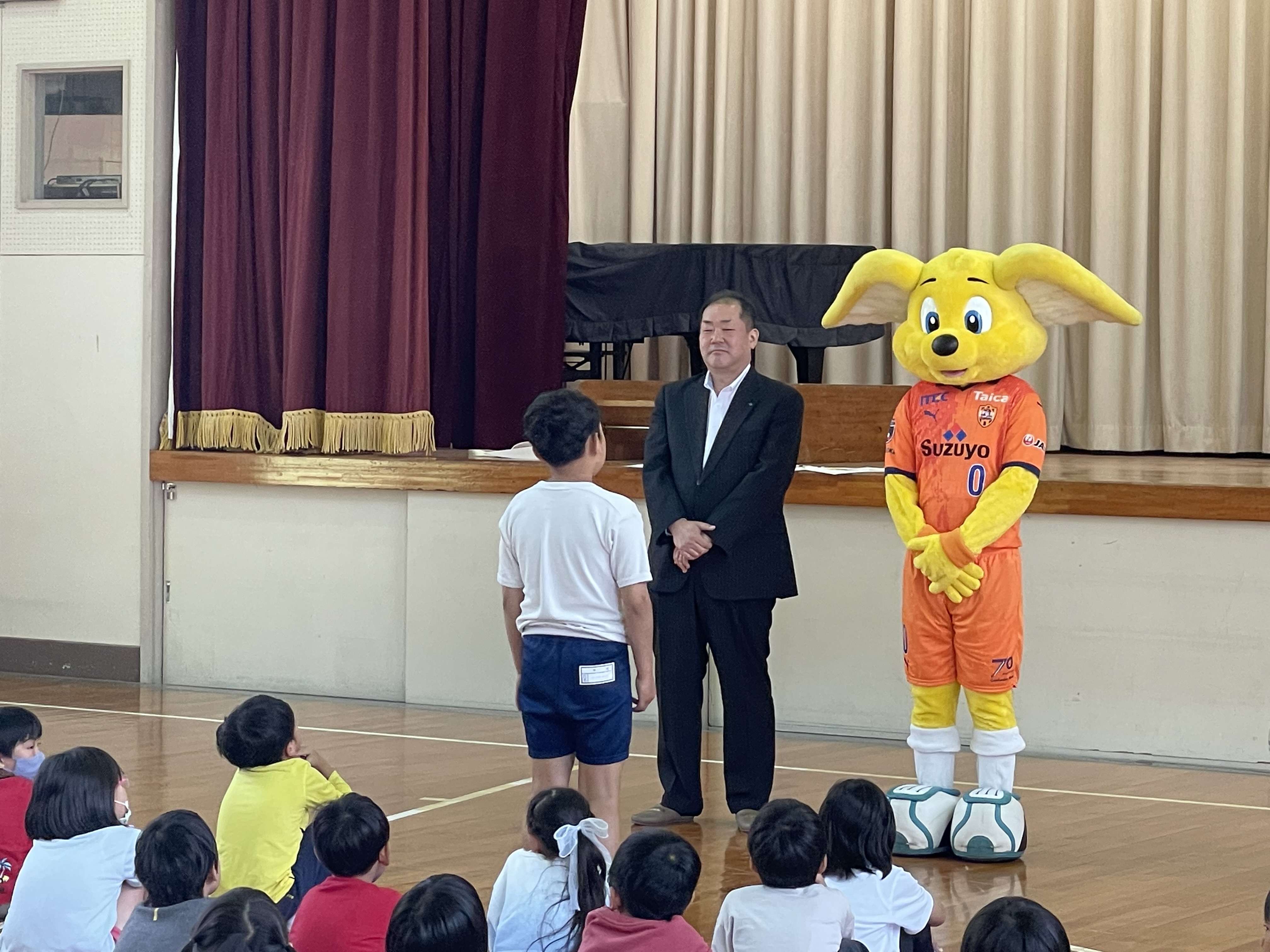 最初に、尾形常務が、「エスパルスには素晴らしい選手がたくさんいて、素晴らしいサッカーをしているので、みんなもいっぱい応援してください。もちろん家族でスタジアムに行く時は、下敷きにも載っているバスの乗り方を見て、シャトルバスで応援に行ってください。みんなには、楽しい学校生活を送って欲しいと思っています。」と挨拶をされ、その後、特別ゲストとしてパルちゃんが登場し、児童たちから大歓声で迎えられました。