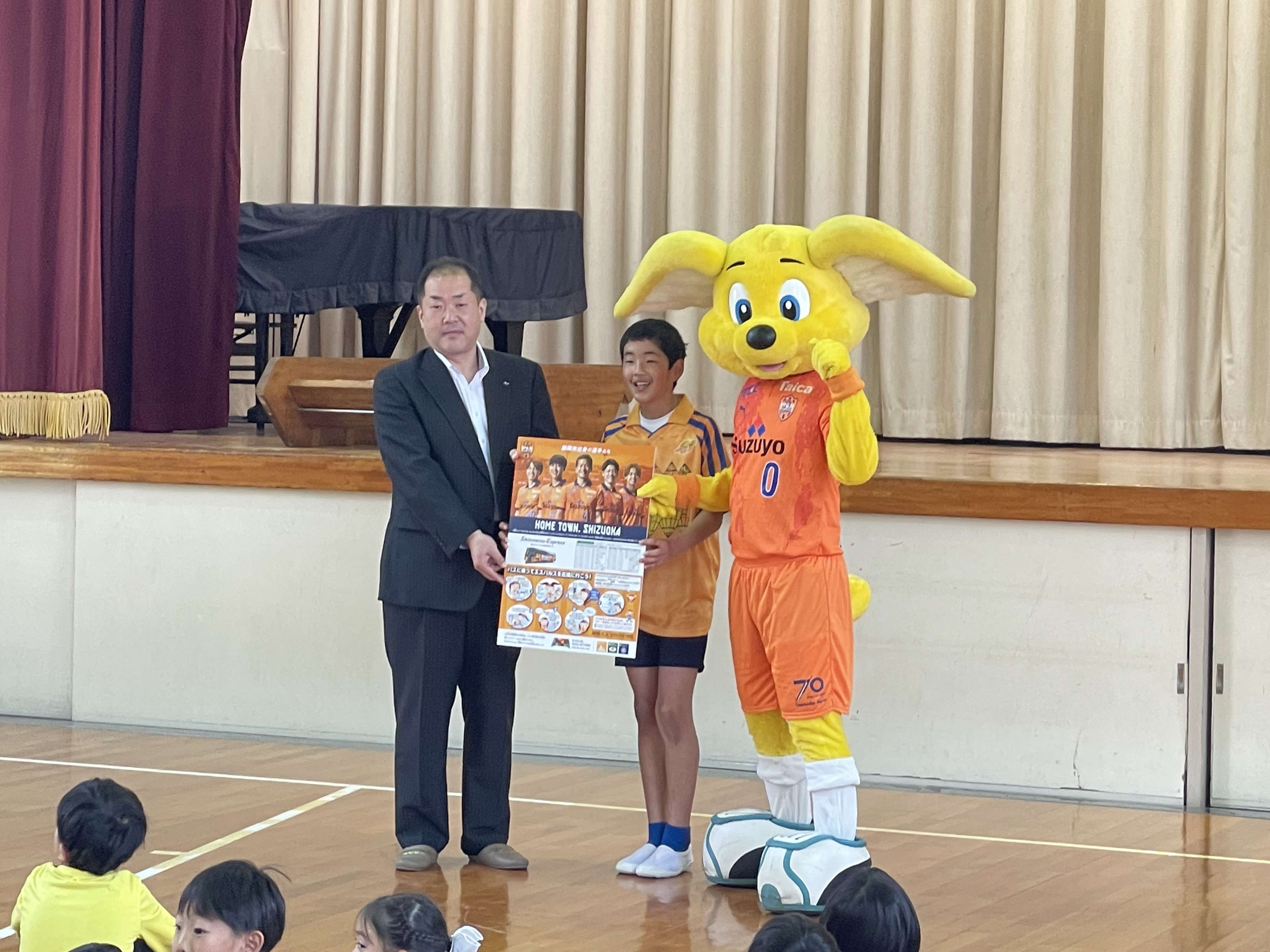 オフィシャルマスコットパルちゃんが、5月9日(火)静岡市立中藁科小学校で行われました『2023エスパルスオリジナル下敷き』贈呈式に参加しました。本企画にご協賛いただきました、しずてつジャストライン株式会社 常務取締役 尾形剛様と共に、全校生徒63名に贈呈しました。