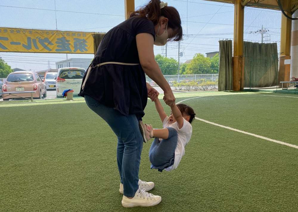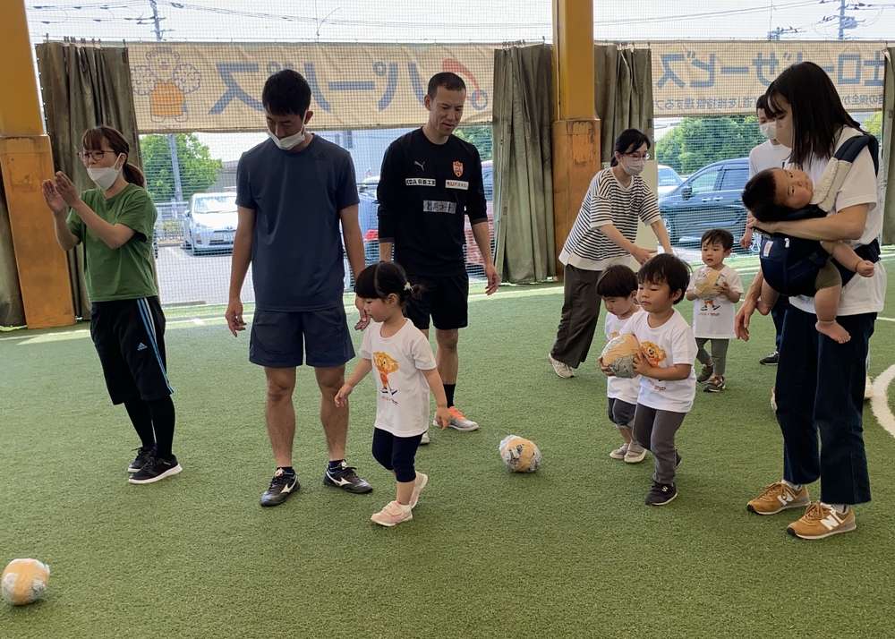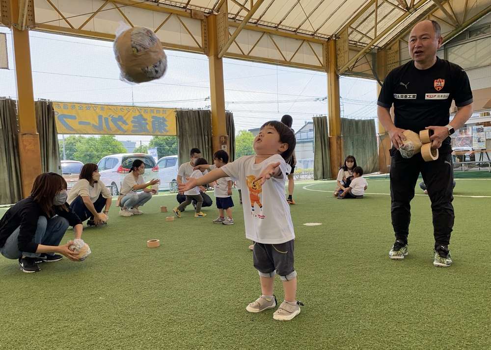 作ったボールを「なげる」・「とる」といった動作を必要とするキャッチボールや、ボールを「ける」・「わたす」動作が主となるシュート練習などを行います。最後はボールを使ったサッカー対決を親子で実施し、ゲーム形式の中で楽しく運動する機会を創出します。