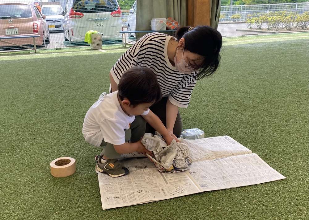 親子で新聞紙を丸めてサッカーボール作りにチャレンジします。手先を使ってモノを作る「工作」は子どもの成長には欠かせない重要な要素の1つとなります。工作を取り入れることで子供たちの好奇心に刺激を与え、集中力を高めます。