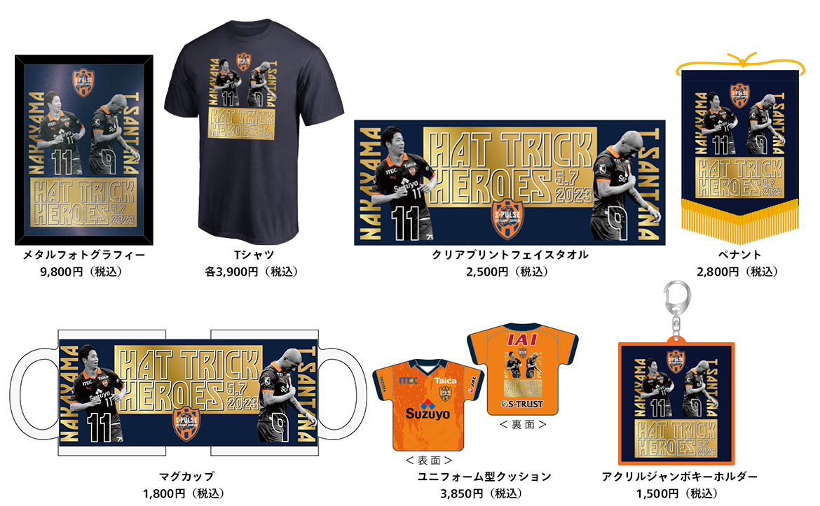 5月7日(日)の明治安田生命J2リーグ 第14節いわきFC戦(HOME)にて、チアゴサンタナ選手と中山克広選手がハットトリックを達成いたしましたので、これを記念して「ハットトリック達成記念グッズ」を受注販売いたします。また1試合で2名の選手がハットトリックを達成したことを記念した「Wハットトリック達成記念グッズ」も受注販売いたしますので、ぜひお買い求めください。